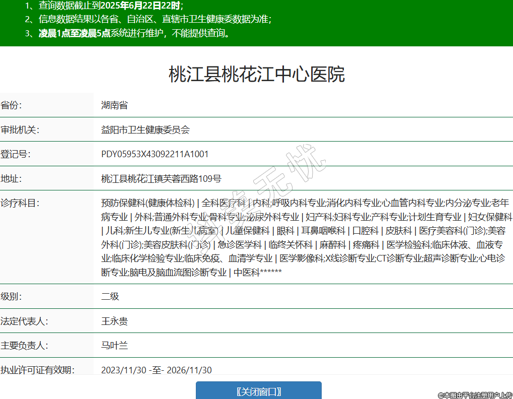 省份:湖南省審批機(jī)關(guān):益陽(yáng)市衛(wèi)生健康委員會(huì)登記號(hào):PDY05953X43092211A1001地址:桃江縣桃花江鎮(zhèn)芙蓉西路109號(hào)診療科目:預(yù)防保健科(健康體檢科) | 全科醫(yī)療科 | 內(nèi)科;呼吸內(nèi)科專業(yè);消化內(nèi)科專業(yè);心血管內(nèi)科專業(yè);內(nèi)分泌專業(yè);老年病專業(yè) | 外科;普通外科專業(yè);骨科專業(yè);泌尿外科專業(yè) | 婦產(chǎn)科;婦科專業(yè);產(chǎn)科專業(yè);計(jì)劃生育專業(yè) | 婦女保健科 | 兒科;新生兒專業(yè)(新生兒病室) | 兒童保健科 | 眼科 | 耳鼻咽喉科 | 口腔科 | 皮膚科 | 醫(yī)療美容科(門(mén)診);美容外科(門(mén)診);美容皮膚科(門(mén)診) | 急診醫(yī)學(xué)科 | 臨終關(guān)懷科 | 麻醉科 | 疼痛科 | 醫(yī)學(xué)檢驗(yàn)科;臨床體液、血液專業(yè);臨床化學(xué)檢驗(yàn)專業(yè);臨床免疫、血清學(xué)專業(yè) | 醫(yī)學(xué)影像科;X線診斷專業(yè);CT診斷專業(yè);超聲診斷專業(yè);心電診斷專業(yè);腦電及腦血流圖診斷專業(yè) | 中醫(yī)科******級(jí)別:二級(jí)法定代表人:王永貴主要負(fù)責(zé)人:馬葉蘭執(zhí)業(yè)許可證有效期:2023/11/30 -至- 2026/11/30 -