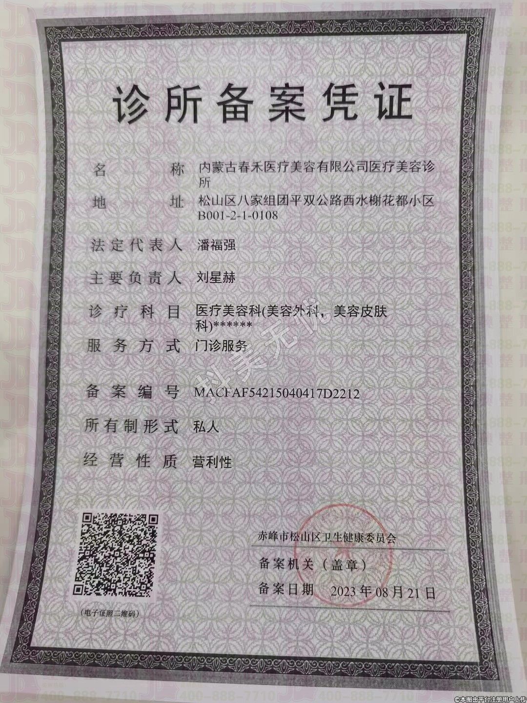 名稱:內(nèi)蒙古春禾醫(yī)療美容有限公司醫(yī)療美容診稱所