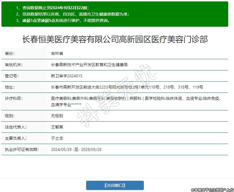 省份:吉林省審批機關(guān):長春高新技術(shù)產(chǎn)業(yè)開發(fā)區(qū)教育和衛(wèi)生健康局登記號:新衛(wèi)審字2024015地址:長春市高新開發(fā)區(qū)前進大街2255號陽光城商住2棟1單元118號、218號、318號、119號診療科目:醫(yī)療美容科;美容外科;美容牙科;美容皮膚科 | 麻醉科 | 醫(yī)學(xué)檢驗科;臨床體液、血液專業(yè);臨床免疫、血清學(xué)專業(yè)******級別:無級別法定代表人:王智昊主要負責(zé)人:于之龍執(zhí)業(yè)許可證有效期:2024/05/29 -至- 2029/05/28信息來源:國家健康衛(wèi)生委員會 -