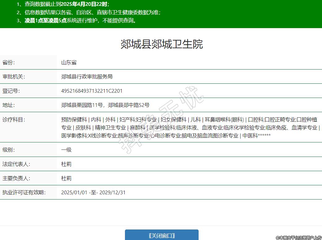 省份:山東省審批機(jī)關(guān):郯城縣行政審批服務(wù)局登記號:49521684937132211C2201地址:郯城縣栗園路11號,郯城縣郯中路52號診療科目:預(yù)防保健科 | 內(nèi)科 | 外科 | 婦產(chǎn)科;婦科專業(yè) | 婦女保健科 | 兒科 | 耳鼻咽喉科(眼科) | 口腔科;口腔正畸專業(yè);口腔種植專業(yè) | 皮膚科 | 精神衛(wèi)生專業(yè) | 麻醉科 | 醫(yī)學(xué)檢驗(yàn)科;臨床體液、血液專業(yè);臨床化學(xué)檢驗(yàn)專業(yè);臨床免疫、血清學(xué)專業(yè) | 醫(yī)學(xué)影像科;X線診斷專業(yè);超聲診斷專業(yè);心電診斷專業(yè);腦電及腦血流圖診斷專業(yè) | 中醫(yī)科******級別:一級法定代表人:杜莉主要負(fù)責(zé)人:杜莉執(zhí)業(yè)許可證有效期:2025/01/01 -至- 2029/12/31 -