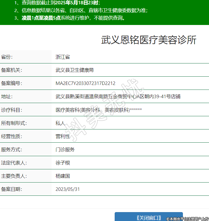 省份:浙江省備案機關(guān):武義縣衛(wèi)生健康局備案編號:MA2EC7Y2033072317D2212地址:武義縣熟溪街道溫泉南路五金商貿(mào)中心A區(qū)朝內(nèi)39-41號店鋪診療科目:醫(yī)療美容科(美容外科、美容皮膚科)******所有制形式:私人經(jīng)營性質(zhì):營利性服務方式:門診服務法定代表人:徐子根主要負責人:楊建國備案日期:2023/05/31 -