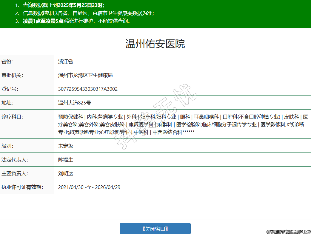省份:浙江省審批機(jī)關(guān):溫州市龍灣區(qū)衛(wèi)生健康局登記號(hào):30772595433030317A3002地址:溫州大道825號(hào)診療科目:預(yù)防保健科 | 內(nèi)科;腎病學(xué)專業(yè) | 外科 | 婦產(chǎn)科;婦科專業(yè) | 眼科 | 耳鼻咽喉科 | 口腔科(不含口腔種植專業(yè)) | 皮膚科 | 醫(yī)療美容科;美容外科;美容皮膚科 | 康復(fù)醫(yī)學(xué)科 | 麻醉科 | 醫(yī)學(xué)檢驗(yàn)科;臨床細(xì)胞分子遺傳學(xué)專業(yè) | 醫(yī)學(xué)影像科;X線診斷專業(yè);超聲診斷專業(yè);心電診斷專業(yè) | 中醫(yī)科 | 中西醫(yī)結(jié)合科******級(jí)別:未定級(jí)法定代表人:陳福生主要負(fù)責(zé)人:劉明達(dá)執(zhí)業(yè)許可證有效期:2021/04/30 -至- 2026/04/29 -