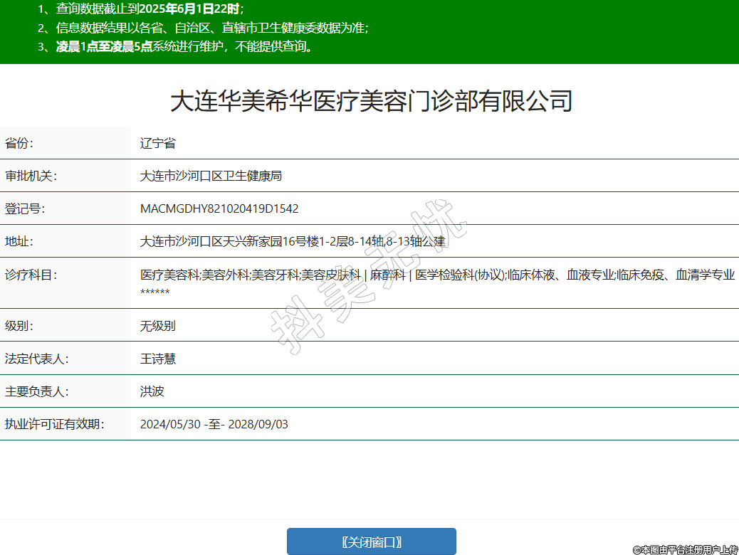 省份:遼寧省審批機關(guān):大連市沙河口區(qū)衛(wèi)生健康局登記號:MACMGDHY821020419D1542地址:大連市沙河口區(qū)天興新家園16號樓1-2層8-14軸,8-13軸公建診療科目:醫(yī)療美容科;美容外科;美容牙科;美容皮膚科 | 麻醉科 | 醫(yī)學(xué)檢驗科(協(xié)議);臨床體液、血液專業(yè);臨床免疫、血清學(xué)專業(yè)******級別:無級別法定代表人:王詩慧主要負(fù)責(zé)人:洪波執(zhí)業(yè)許可證有效期:2024/05/30 -至- 2028/09/03 -