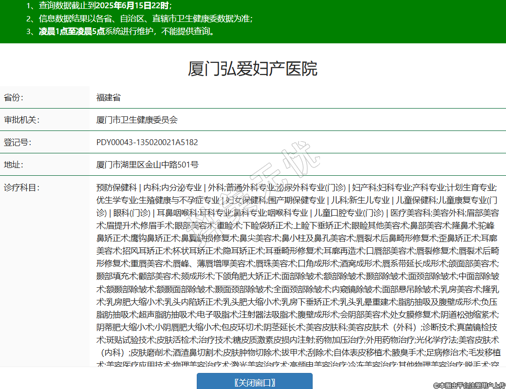 省份:福建省審批機關:廈門市衛(wèi)生健康委員會登記號:PDY00043-135020021A5182地址:廈門市湖里區(qū)金山中路501號診療科目:預防保健科 | 內(nèi)科;內(nèi)分泌專業(yè) | 外科;普通外科專業(yè);泌尿外科專業(yè)(門診) | 婦產(chǎn)科;婦科專業(yè);產(chǎn)科專業(yè);計劃生育專業(yè);優(yōu)生學專業(yè);生殖健康與不孕癥專業(yè) | 婦女保健科;圍產(chǎn)期保健專業(yè) | 兒科;新生兒專業(yè) | 兒童保健科;兒童康復專業(yè)(門診) | 眼科(門診) | 耳鼻咽喉科;耳科專業(yè);鼻科專業(yè);咽喉科專業(yè) | 兒童口腔專業(yè)(門診) | 醫(yī)療美容科;美容外科;眉部美容術;眉提升術;修眉手術;眼部美容術;重瞼術;下瞼袋矯正術;上瞼下垂矯正術;眼瞼其他美容術;鼻部美容術;隆鼻術;駝峰鼻矯正術;鷹鉤鼻矯正術;鼻翼缺損修復術;鼻尖美容術;鼻小柱及鼻孔美容術;唇裂術后鼻畸形修復術;歪鼻矯正術;耳廓美容術;招風耳矯正術;杯狀耳矯正術;隱耳矯正術;耳垂畸形修復術;耳廓再造術;口唇部美容術;唇裂修復術;唇裂術后畸形修復術;重唇美容術;唇峰、薄唇增厚美容術;唇珠美容術;口角成形術;酒窩成形術;唇系帶延長成形術;頜面部美容術;顳部填充術;顴部美容術;頦成形術;下頜角肥大矯正術;面部除皺術;額部除皺術;顳部除皺術;面頸部除皺術;中面部除皺術;額顳部除皺術;額顳面部除皺術;顳面頸部除皺術;全面頸部除皺術;內(nèi)窺鏡除皺術;面部懸吊除皺術;乳房美容術;隆乳術;乳房肥大縮小術;乳頭內(nèi)陷矯正術;乳頭肥大縮小術;乳房下垂矯正術;乳頭乳暈重建術;脂肪抽吸及腹壁成形術;負壓脂肪抽吸術;超聲脂肪抽吸術;電子吸脂術;注射器法吸脂術;腹壁成形術;會陰部美容術;處女膜修復術;陰道松弛縮緊術;陰蒂肥大縮小術;小陰唇肥大縮小術;包皮環(huán)切術;陰莖延長術;美容皮膚科;美容皮膚術(外科);診斷技術;真菌鏡檢技術;斑貼試驗技術;皮膚活檢術;治療技術;糖皮質(zhì)激素皮損內(nèi)注射;藥物加壓治療;外用藥物治療;光化學療法;美容皮膚術(內(nèi)科);皮膚磨削術;酒渣鼻切割術;皮膚腫物切除術;拔甲術;刮除術;自體表皮移植術;腋臭手術;足病修治術;毛發(fā)移植術;美容醫(yī)療應用技術;物理美容治療術;激光美容治療術;高頻電美容治療;冷凍美容治療;其他物理美容治療;脫毛術;穿耳孔術;注射美容技術;A型肉毒毒素美容注射技術;皮膚(軟組織)注射(填充)美容;美容文飾技術;文眉技術;文眼線技術;文唇技術;不良文飾修復技術 | 急診醫(yī)學科 | 麻醉科 | 醫(yī)學檢驗科;臨床體液、血液專業(yè);臨床微生物學專業(yè);臨床化學檢驗專業(yè);臨床免疫、血清學專業(yè);臨床細胞分子遺傳學專業(yè)(協(xié)議) | 病理科(協(xié)議) | 醫(yī)學影像科;X線診斷專業(yè);CT診斷專業(yè);磁共振成像診斷專業(yè);超聲診斷專業(yè);心電診斷專業(yè)(協(xié)議) | 中醫(yī)科;婦產(chǎn)科專業(yè) | 中西醫(yī)結合科******級別:三級法定代表人:徐偉主要負責人:邱娜璇執(zhí)業(yè)許可證有效期:2025/01/10 -至- 2027/07/20 -