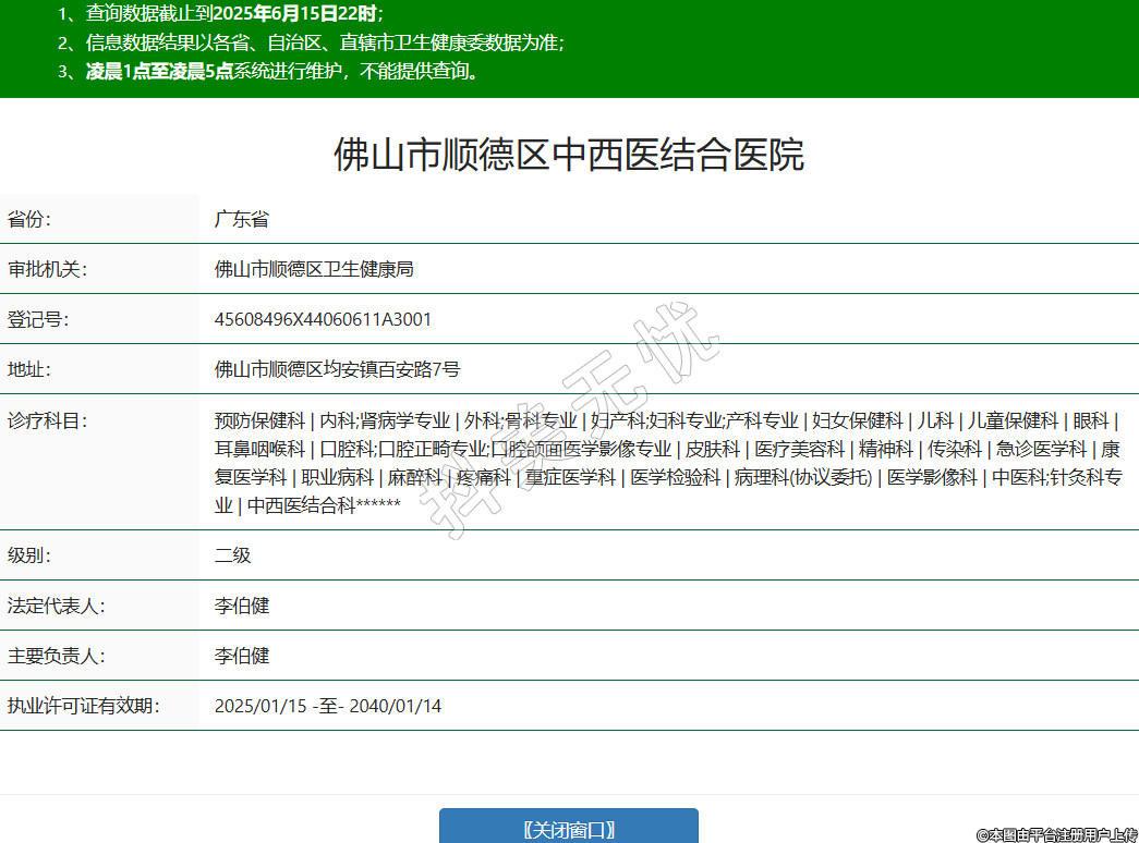 省份:廣東省審批機(jī)關(guān):佛山市順德區(qū)衛(wèi)生健康局登記號:45608496X44060611A3001地址:佛山市順德區(qū)均安鎮(zhèn)百安路7號診療科目:預(yù)防保健科 | 內(nèi)科;腎病學(xué)專業(yè) | 外科;骨科專業(yè) | 婦產(chǎn)科;婦科專業(yè);產(chǎn)科專業(yè) | 婦女保健科 | 兒科 | 兒童保健科 | 眼科 | 耳鼻咽喉科 | 口腔科;口腔正畸專業(yè);口腔頜面醫(yī)學(xué)影像專業(yè) | 皮膚科 | 醫(yī)療美容科 | 精神科 | 傳染科 | 急診醫(yī)學(xué)科 | 康復(fù)醫(yī)學(xué)科 | 職業(yè)病科 | 麻醉科 | 疼痛科 | 重癥醫(yī)學(xué)科 | 醫(yī)學(xué)檢驗(yàn)科 | 病理科(協(xié)議委托) | 醫(yī)學(xué)影像科 | 中醫(yī)科;針灸科專業(yè) | 中西醫(yī)結(jié)合科******級別:二級法定代表人:李伯健主要負(fù)責(zé)人:李伯健執(zhí)業(yè)許可證有效期:2025/01/15 -至- 2040/01/14 -