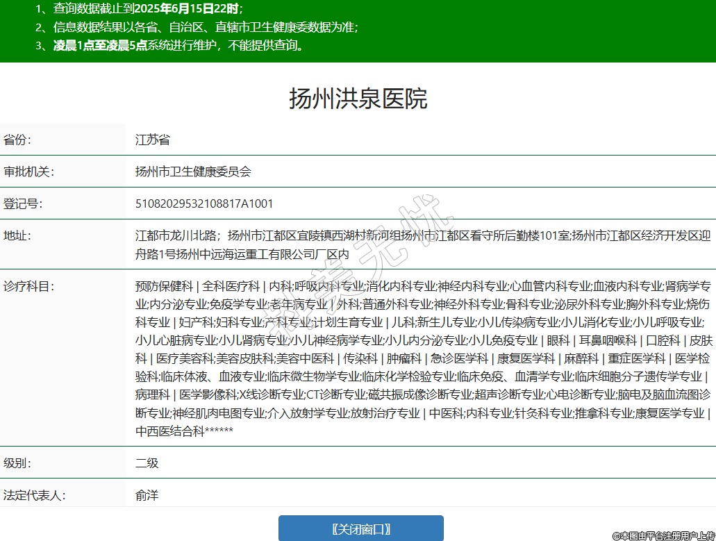 省份:江蘇省審批機關:揚州市衛(wèi)生健康委員會登記號:51082029532108817A1001地址:江都市龍川北路;揚州市江都區(qū)宜陵鎮(zhèn)西湖村新河組揚州市江都區(qū)看守所后勤樓101室;揚州市江都區(qū)經濟開發(fā)區(qū)迎舟路1號揚州中遠海運重工有限公司廠區(qū)內診療科目:預防保健科 | 全科醫(yī)療科 | 內科;呼吸內科專業(yè);消化內科專業(yè);神經內科專業(yè);心血管內科專業(yè);血液內科專業(yè);腎病學專業(yè);內分泌專業(yè);免疫學專業(yè);老年病專業(yè) | 外科;普通外科專業(yè);神經外科專業(yè);骨科專業(yè);泌尿外科專業(yè);胸外科專業(yè);燒傷科專業(yè) | 婦產科;婦科專業(yè);產科專業(yè);計劃生育專業(yè) | 兒科;新生兒專業(yè);小兒傳染病專業(yè);小兒消化專業(yè);小兒呼吸專業(yè);小兒心臟病專業(yè);小兒腎病專業(yè);小兒神經病學專業(yè);小兒內分泌專業(yè);小兒免疫專業(yè) | 眼科 | 耳鼻咽喉科 | 口腔科 | 皮膚科 | 醫(yī)療美容科;美容皮膚科;美容中醫(yī)科 | 傳染科 | 腫瘤科 | 急診醫(yī)學科 | 康復醫(yī)學科 | 麻醉科 | 重癥醫(yī)學科 | 醫(yī)學檢驗科;臨床體液、血液專業(yè);臨床微生物學專業(yè);臨床化學檢驗專業(yè);臨床免疫、血清學專業(yè);臨床細胞分子遺傳學專業(yè) | 病理科 | 醫(yī)學影像科;X線診斷專業(yè);CT診斷專業(yè);磁共振成像診斷專業(yè);超聲診斷專業(yè);心電診斷專業(yè);腦電及腦血流圖診斷專業(yè);神經肌肉電圖專業(yè);介入放射學專業(yè);放射治療專業(yè) | 中醫(yī)科;內科專業(yè);針灸科專業(yè);推拿科專業(yè);康復醫(yī)學專業(yè) | 中西醫(yī)結合科******級別:二級法定代表人:俞洋主要負責人:李成存執(zhí)業(yè)許可證有效期:2025/01/21 -至- 2035/09/21 -