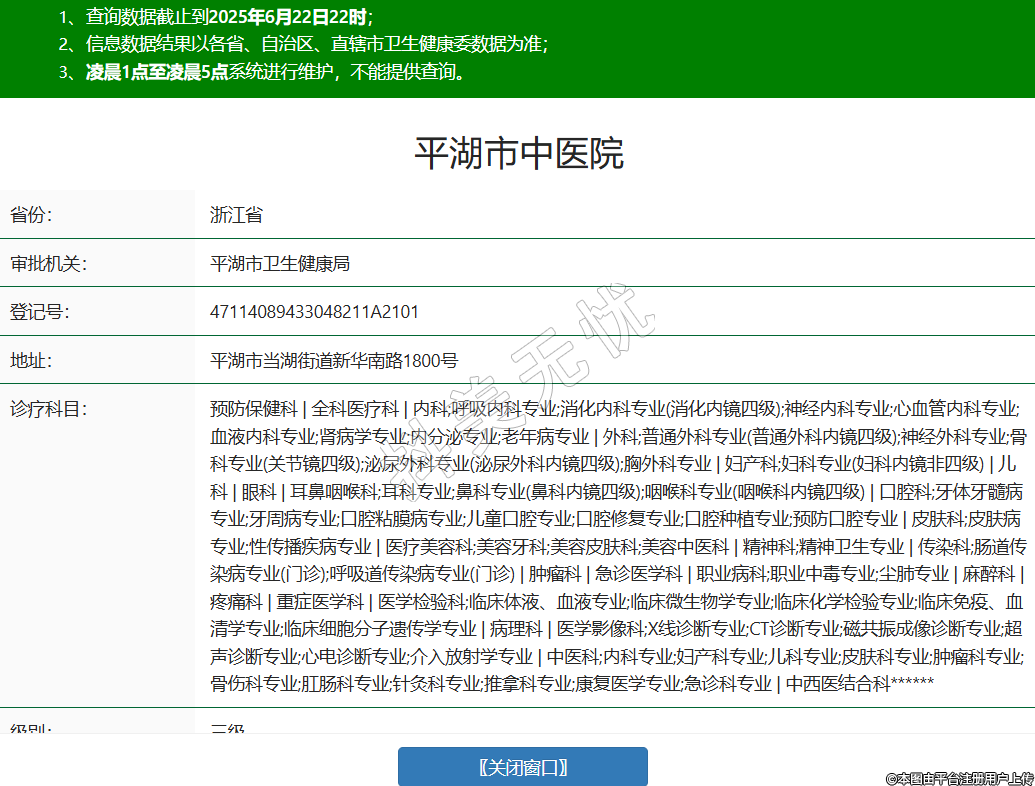 省份:浙江省審批機關(guān):平湖市衛(wèi)生健康局登記號:47114089433048211A2101地址:平湖市當湖街道新華南路1800號診療科目:預防保健科 | 全科醫(yī)療科 | 內(nèi)科;呼吸內(nèi)科專業(yè);消化內(nèi)科專業(yè)(消化內(nèi)鏡四級);神經(jīng)內(nèi)科專業(yè);心血管內(nèi)科專業(yè);血液內(nèi)科專業(yè);腎病學專業(yè);內(nèi)分泌專業(yè);老年病專業(yè) | 外科;普通外科專業(yè)(普通外科內(nèi)鏡四級);神經(jīng)外科專業(yè);骨科專業(yè)(關(guān)節(jié)鏡四級);泌尿外科專業(yè)(泌尿外科內(nèi)鏡四級);胸外科專業(yè) | 婦產(chǎn)科;婦科專業(yè)(婦科內(nèi)鏡非四級) | 兒科 | 眼科 | 耳鼻咽喉科;耳科專業(yè);鼻科專業(yè)(鼻科內(nèi)鏡四級);咽喉科專業(yè)(咽喉科內(nèi)鏡四級) | 口腔科;牙體牙髓病專業(yè);牙周病專業(yè);口腔粘膜病專業(yè);兒童口腔專業(yè);口腔修復專業(yè);口腔種植專業(yè);預防口腔專業(yè) | 皮膚科;皮膚病專業(yè);性傳播疾病專業(yè) | 醫(yī)療美容科;美容牙科;美容皮膚科;美容中醫(yī)科 | 精神科;精神衛(wèi)生專業(yè) | 傳染科;腸道傳染病專業(yè)(門診);呼吸道傳染病專業(yè)(門診) | 腫瘤科 | 急診醫(yī)學科 | 職業(yè)病科;職業(yè)中毒專業(yè);塵肺專業(yè) | 麻醉科 | 疼痛科 | 重癥醫(yī)學科 | 醫(yī)學檢驗科;臨床體液、血液專業(yè);臨床微生物學專業(yè);臨床化學檢驗專業(yè);臨床免疫、血清學專業(yè);臨床細胞分子遺傳學專業(yè) | 病理科 | 醫(yī)學影像科;X線診斷專業(yè);CT診斷專業(yè);磁共振成像診斷專業(yè);超聲診斷專業(yè);心電診斷專業(yè);介入放射學專業(yè) | 中醫(yī)科;內(nèi)科專業(yè);婦產(chǎn)科專業(yè);兒科專業(yè);皮膚科專業(yè);腫瘤科專業(yè);骨傷科專業(yè);肛腸科專業(yè);針灸科專業(yè);推拿科專業(yè);康復醫(yī)學專業(yè);急診科專業(yè) | 中西醫(yī)結(jié)合科******級別:三級法定代表人:吳勇彬主要負責人:吳勇彬執(zhí)業(yè)許可證有效期:2024/02/05 -至- 2027/02/04 -