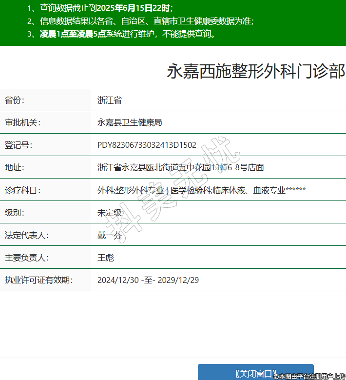 省份:浙江省審批機關(guān):永嘉縣衛(wèi)生健康局登記號:PDY82306733032413D1502地址:浙江省永嘉縣甌北街道五中花園13幢6-8號店面診療科目:外科;整形外科專業(yè) | 醫(yī)學(xué)檢驗科;臨床體液、血液專業(yè)******級別:未定級法定代表人:戴一芬主要負責(zé)人:王彪執(zhí)業(yè)許可證有效期:2024/12/30 -至- 2029/12/29 -