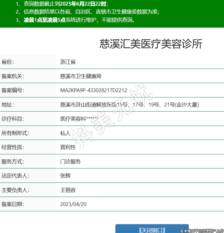 省份:浙江省備案機(jī)關(guān):慈溪市衛(wèi)生健康局備案編號:MA2KPA9P-433028217D2212地址:慈溪市滸山街道解放東街15號、17號、19號、21號(金沙大廈)診療科目:醫(yī)療美容科******所有制形式:私人經(jīng)營性質(zhì):營利性服務(wù)方式:門診服務(wù)法定代表人:張輝主要負(fù)責(zé)人:王艷容備案日期:2023/04/20 -