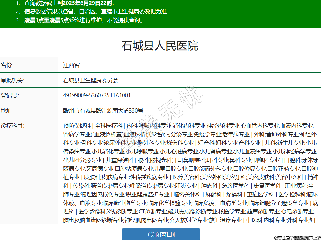 省份:江西省審批機(jī)關(guān):石城縣衛(wèi)生健康委員會登記號:49199009-536073511A1001地址:贛州市石城縣贛江源南大道330號診療科目:預(yù)防保健科 | 全科醫(yī)療科 | 內(nèi)科;呼吸內(nèi)科專業(yè);消化內(nèi)科專業(yè);神經(jīng)內(nèi)科專業(yè);心血管內(nèi)科專業(yè);血液內(nèi)科專業(yè);腎病學(xué)專業(yè)(“血液透析室”血液透析機(jī)52臺);內(nèi)分泌專業(yè);免疫學(xué)專業(yè);老年病專業(yè) | 外科;普通外科專業(yè);神經(jīng)外科專業(yè);骨科專業(yè);泌尿外科專業(yè);胸外科專業(yè);燒傷科專業(yè) | 婦產(chǎn)科;婦科專業(yè);產(chǎn)科專業(yè) | 兒科;新生兒專業(yè);小兒傳染病專業(yè);小兒消化專業(yè);小兒呼吸專業(yè);小兒心臟病專業(yè);小兒腎病專業(yè);小兒血液病專業(yè);小兒神經(jīng)病學(xué)專業(yè);小兒內(nèi)分泌專業(yè) | 兒童保健科 | 眼科(眼視光科) | 耳鼻咽喉科;耳科專業(yè);鼻科專業(yè);咽喉科專業(yè) | 口腔科;牙體牙髓病專業(yè);牙周病專業(yè);口腔粘膜病專業(yè);兒童口腔專業(yè);口腔頜面外科專業(yè);口腔修復(fù)專業(yè);口腔正畸專業(yè);口腔種植專業(yè) | 皮膚科;皮膚病專業(yè);性傳播疾病專業(yè) | 醫(yī)療美容科;美容外科;美容牙科;美容皮膚科;美容中醫(yī)科 | 精神科 | 傳染科;腸道傳染病專業(yè);呼吸道傳染病專業(yè);肝炎專業(yè) | 腫瘤科 | 急診醫(yī)學(xué)科 | 康復(fù)醫(yī)學(xué)科 | 職業(yè)病科;塵肺專業(yè);物理因素?fù)p傷專業(yè);職業(yè)健康監(jiān)護(hù)專業(yè) | 臨終關(guān)懷科 | 麻醉科 | 疼痛科 | 重癥醫(yī)學(xué)科 | 醫(yī)學(xué)檢驗(yàn)科;臨床體液、血液專業(yè);臨床微生物學(xué)專業(yè);臨床化學(xué)檢驗(yàn)專業(yè);臨床免疫、血清學(xué)專業(yè);臨床細(xì)胞分子遺傳學(xué)專業(yè) | 病理科 | 醫(yī)學(xué)影像科;X線診斷專業(yè);CT診斷專業(yè);磁共振成像診斷專業(yè);核醫(yī)學(xué)專業(yè);超聲診斷專業(yè);心電診斷專業(yè);腦電及腦血流圖診斷專業(yè);神經(jīng)肌肉電圖專業(yè);介入放射學(xué)專業(yè);放射治療專業(yè) | 中醫(yī)科;內(nèi)科專業(yè);外科專業(yè);婦產(chǎn)科專業(yè);兒科專業(yè);皮膚科專業(yè);腫瘤科專業(yè);骨傷科專業(yè);肛腸科專業(yè);老年病科專業(yè);針灸科專業(yè);推拿科專業(yè);康復(fù)醫(yī)學(xué)專業(yè);急診科專業(yè);預(yù)防保健科專業(yè) | 中西醫(yī)結(jié)合科******級別:三級法定代表人:吳優(yōu)明主要負(fù)責(zé)人:吳優(yōu)明執(zhí)業(yè)許可證有效期:2024/07/01 -至- 2029/06/30 -