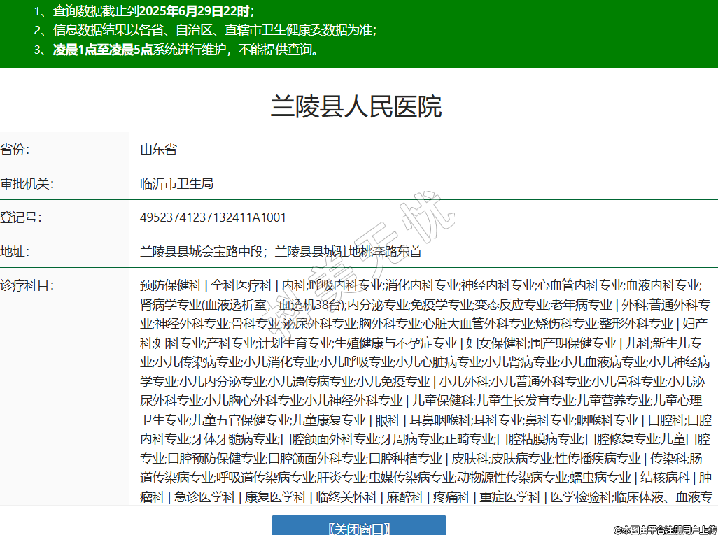 省份:山東省審批機關(guān):臨沂市衛(wèi)生局登記號:49523741237132411A1001地址:蘭陵縣縣城會寶路中段;蘭陵縣縣城駐地桃李路東首診療科目:預(yù)防保健科 | 全科醫(yī)療科 | 內(nèi)科;呼吸內(nèi)科專業(yè);消化內(nèi)科專業(yè);神經(jīng)內(nèi)科專業(yè);心血管內(nèi)科專業(yè);血液內(nèi)科專業(yè);腎病學(xué)專業(yè)(血液透析室,血透機38臺);內(nèi)分泌專業(yè);免疫學(xué)專業(yè);變態(tài)反應(yīng)專業(yè);老年病專業(yè) | 外科;普通外科專業(yè);神經(jīng)外科專業(yè);骨科專業(yè);泌尿外科專業(yè);胸外科專業(yè);心臟大血管外科專業(yè);燒傷科專業(yè);整形外科專業(yè) | 婦產(chǎn)科;婦科專業(yè);產(chǎn)科專業(yè);計劃生育專業(yè);生殖健康與不孕癥專業(yè) | 婦女保健科;圍產(chǎn)期保健專業(yè) | 兒科;新生兒專業(yè);小兒傳染病專業(yè);小兒消化專業(yè);小兒呼吸專業(yè);小兒心臟病專業(yè);小兒腎病專業(yè);小兒血液病專業(yè);小兒神經(jīng)病學(xué)專業(yè);小兒內(nèi)分泌專業(yè);小兒遺傳病專業(yè);小兒免疫專業(yè) | 小兒外科;小兒普通外科專業(yè);小兒骨科專業(yè);小兒泌尿外科專業(yè);小兒胸心外科專業(yè);小兒神經(jīng)外科專業(yè) | 兒童保健科;兒童生長發(fā)育專業(yè);兒童營養(yǎng)專業(yè);兒童心理衛(wèi)生專業(yè);兒童五官保健專業(yè);兒童康復(fù)專業(yè) | 眼科 | 耳鼻咽喉科;耳科專業(yè);鼻科專業(yè);咽喉科專業(yè) | 口腔科;口腔內(nèi)科專業(yè);牙體牙髓病專業(yè);口腔頜面外科專業(yè);牙周病專業(yè);正畸專業(yè);口腔粘膜病專業(yè);口腔修復(fù)專業(yè);兒童口腔專業(yè);口腔預(yù)防保健專業(yè);口腔頜面外科專業(yè);口腔種植專業(yè) | 皮膚科;皮膚病專業(yè);性傳播疾病專業(yè) | 傳染科;腸道傳染病專業(yè);呼吸道傳染病專業(yè);肝炎專業(yè);蟲媒傳染病專業(yè);動物源性傳染病專業(yè);蠕蟲病專業(yè) | 結(jié)核病科 | 腫瘤科 | 急診醫(yī)學(xué)科 | 康復(fù)醫(yī)學(xué)科 | 臨終關(guān)懷科 | 麻醉科 | 疼痛科 | 重癥醫(yī)學(xué)科 | 醫(yī)學(xué)檢驗科;臨床體液、血液專業(yè);臨床微生物學(xué)專業(yè);臨床化學(xué)檢驗專業(yè);臨床免疫、血清學(xué)專業(yè);臨床細胞分子遺傳學(xué)專業(yè) | 病理科 | 醫(yī)學(xué)影像科;X線診斷專業(yè);CT診斷專業(yè);磁共振成像診斷專業(yè);核醫(yī)學(xué)專業(yè);超聲診斷專業(yè);心電診斷專業(yè);腦電及腦血流圖診斷專業(yè);神經(jīng)肌肉電圖專業(yè);介入放射學(xué)專業(yè);放射治療專業(yè) | 中醫(yī)科;內(nèi)科專業(yè);外科專業(yè);婦產(chǎn)科專業(yè);兒科專業(yè);皮膚科專業(yè);眼科專業(yè);耳鼻咽喉科專業(yè);口腔科專業(yè);腫瘤科專業(yè);骨傷科專業(yè);肛腸科專業(yè);老年病科專業(yè);針灸科專業(yè);推拿科專業(yè);康復(fù)醫(yī)學(xué)專業(yè);急診科專業(yè);預(yù)防保健科專業(yè) | 中西醫(yī)結(jié)合科******級別:二級法定代表人:秦西平主要負責人:高巖執(zhí)業(yè)許可證有效期:2025/03/11 -至- 2029/12/31 -