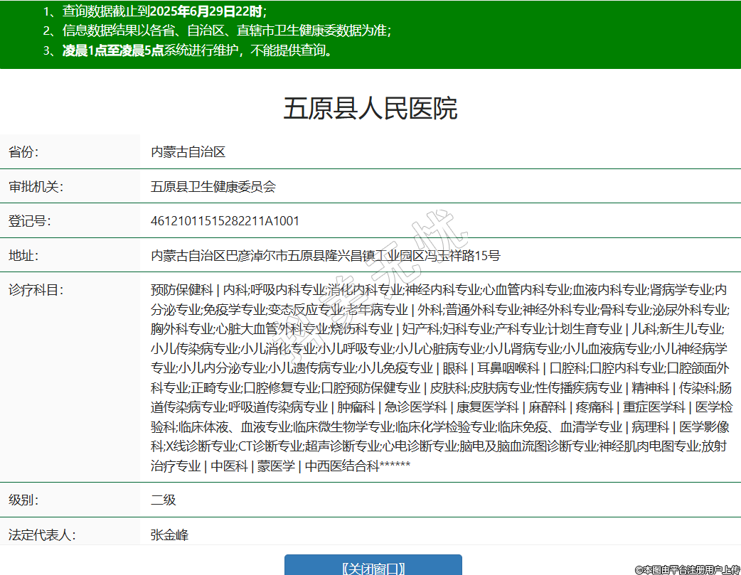 省份:內(nèi)蒙古自治區(qū)審批機關(guān):五原縣衛(wèi)生健康委員會登記號:46121011515282211A1001地址:內(nèi)蒙古自治區(qū)巴彥淖爾市五原縣隆興昌鎮(zhèn)工業(yè)園區(qū)馮玉祥路15號診療科目:預(yù)防保健科 | 內(nèi)科;呼吸內(nèi)科專業(yè);消化內(nèi)科專業(yè);神經(jīng)內(nèi)科專業(yè);心血管內(nèi)科專業(yè);血液內(nèi)科專業(yè);腎病學(xué)專業(yè);內(nèi)分泌專業(yè);免疫學(xué)專業(yè);變態(tài)反應(yīng)專業(yè);老年病專業(yè) | 外科;普通外科專業(yè);神經(jīng)外科專業(yè);骨科專業(yè);泌尿外科專業(yè);胸外科專業(yè);心臟大血管外科專業(yè);燒傷科專業(yè) | 婦產(chǎn)科;婦科專業(yè);產(chǎn)科專業(yè);計劃生育專業(yè) | 兒科;新生兒專業(yè);小兒傳染病專業(yè);小兒消化專業(yè);小兒呼吸專業(yè);小兒心臟病專業(yè);小兒腎病專業(yè);小兒血液病專業(yè);小兒神經(jīng)病學(xué)專業(yè);小兒內(nèi)分泌專業(yè);小兒遺傳病專業(yè);小兒免疫專業(yè) | 眼科 | 耳鼻咽喉科 | 口腔科;口腔內(nèi)科專業(yè);口腔頜面外科專業(yè);正畸專業(yè);口腔修復(fù)專業(yè);口腔預(yù)防保健專業(yè) | 皮膚科;皮膚病專業(yè);性傳播疾病專業(yè) | 精神科 | 傳染科;腸道傳染病專業(yè);呼吸道傳染病專業(yè) | 腫瘤科 | 急診醫(yī)學(xué)科 | 康復(fù)醫(yī)學(xué)科 | 麻醉科 | 疼痛科 | 重癥醫(yī)學(xué)科 | 醫(yī)學(xué)檢驗科;臨床體液、血液專業(yè);臨床微生物學(xué)專業(yè);臨床化學(xué)檢驗專業(yè);臨床免疫、血清學(xué)專業(yè) | 病理科 | 醫(yī)學(xué)影像科;X線診斷專業(yè);CT診斷專業(yè);超聲診斷專業(yè);心電診斷專業(yè);腦電及腦血流圖診斷專業(yè);神經(jīng)肌肉電圖專業(yè);放射治療專業(yè) | 中醫(yī)科 | 蒙醫(yī)學(xué) | 中西醫(yī)結(jié)合科******級別:二級法定代表人:張金峰主要負(fù)責(zé)人:張金峰執(zhí)業(yè)許可證有效期:2021/01/01 -至- 2025/12/31 -