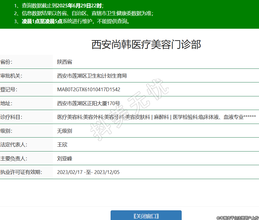 省份:陜西省審批機(jī)關(guān):西安市蓮湖區(qū)衛(wèi)生和計(jì)劃生育局登記號(hào):MAB0T2GTX61010417D1542地址:西安市蓮湖區(qū)正陽大廈170號(hào)診療科目:醫(yī)療美容科;美容外科;美容牙科;美容皮膚科 | 麻醉科 | 醫(yī)學(xué)檢驗(yàn)科;臨床體液、血液專業(yè)******級(jí)別:無級(jí)別法定代表人:王欣主要負(fù)責(zé)人:劉亞峰執(zhí)業(yè)許可證有效期:2023/02/17 -至- 2023/12/05 -