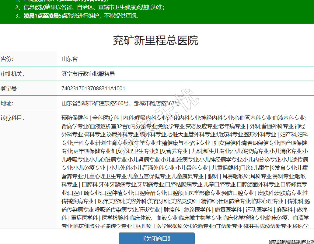省份:山東省審批機關(guān):濟寧市行政審批服務(wù)局登記號:74023170137088311A1001地址:山東省鄒城市礦建東路560號、鄒城市鮑店路367號診療科目:預防保健科 | 全科醫(yī)療科 | 內(nèi)科;呼吸內(nèi)科專業(yè);消化內(nèi)科專業(yè);神經(jīng)內(nèi)科專業(yè);心血管內(nèi)科專業(yè);血液內(nèi)科專業(yè);腎病學專業(yè)(血液透析室32臺);內(nèi)分泌專業(yè);免疫學專業(yè);變態(tài)反應(yīng)專業(yè);老年病專業(yè) | 外科;普通外科專業(yè);神經(jīng)外科專業(yè);骨科專業(yè);泌尿外科專業(yè);胸外科專業(yè);心臟大血管外科專業(yè);燒傷科專業(yè);整形外科專業(yè) | 婦產(chǎn)科;婦科專業(yè);產(chǎn)科專業(yè);計劃生育專業(yè);優(yōu)生學專業(yè);生殖健康與不孕癥專業(yè) | 婦女保健科;青春期保健專業(yè);圍產(chǎn)期保健專業(yè);更年期保健專業(yè);婦女心理衛(wèi)生專業(yè);婦女營養(yǎng)專業(yè) | 兒科;新生兒專業(yè);小兒傳染病專業(yè);小兒消化專業(yè);小兒呼吸專業(yè);小兒心臟病專業(yè);小兒腎病專業(yè);小兒血液病專業(yè);小兒神經(jīng)病學專業(yè);小兒內(nèi)分泌專業(yè);小兒遺傳病專業(yè);小兒免疫專業(yè) | 小兒外科;小兒普通外科專業(yè);小兒骨科專業(yè) | 兒童保健科(門診);兒童生長發(fā)育專業(yè);兒童營養(yǎng)專業(yè);兒童心理衛(wèi)生專業(yè);兒童五官保健專業(yè);兒童康復專業(yè) | 眼科 | 耳鼻咽喉科;耳科專業(yè);鼻科專業(yè);咽喉科專業(yè) | 口腔科;牙體牙髓病專業(yè);牙周病專業(yè);口腔粘膜病專業(yè);兒童口腔專業(yè);口腔頜面外科專業(yè);口腔修復專業(yè);口腔正畸專業(yè);口腔種植專業(yè);口腔麻醉專業(yè);口腔頜面醫(yī)學影像專業(yè);預防口腔專業(yè) | 皮膚科;皮膚病專業(yè);性傳播疾病專業(yè) | 醫(yī)療美容科;美容外科;美容牙科;美容皮膚科 | 精神科;社區(qū)防治專業(yè);臨床心理專業(yè) | 傳染科;腸道傳染病專業(yè);呼吸道傳染病專業(yè);肝炎專業(yè) | 腫瘤科 | 急診醫(yī)學科 | 康復醫(yī)學科 | 運動醫(yī)學科 | 麻醉科 | 疼痛科 | 重癥醫(yī)學科 | 醫(yī)學檢驗科;臨床體液、血液專業(yè);臨床微生物學專業(yè);臨床化學檢驗專業(yè);臨床免疫、血清學專業(yè);臨床細胞分子遺傳學專業(yè) | 病理科 | 醫(yī)學影像科;X線診斷專業(yè);CT診斷專業(yè);磁共振成像診斷專業(yè);核醫(yī)學專業(yè);超聲診斷專業(yè);心電診斷專業(yè);腦電及腦血流圖診斷專業(yè);神經(jīng)肌肉電圖專業(yè);介入放射學專業(yè);放射治療專業(yè) | 中醫(yī)科;內(nèi)科專業(yè);外科專業(yè);婦產(chǎn)科專業(yè);兒科專業(yè);皮膚科專業(yè);眼科專業(yè);耳鼻咽喉科專業(yè);口腔科專業(yè);腫瘤科專業(yè);骨傷科專業(yè);肛腸科專業(yè);老年病科專業(yè);針灸科專業(yè);推拿科專業(yè);康復醫(yī)學專業(yè);急診科專業(yè);預防保健科專業(yè)******級別:三級法定代表人:王愛亮主要負責人:王愛亮執(zhí)業(yè)許可證有效期:2024/03/08 -至- 2033/12/31 -