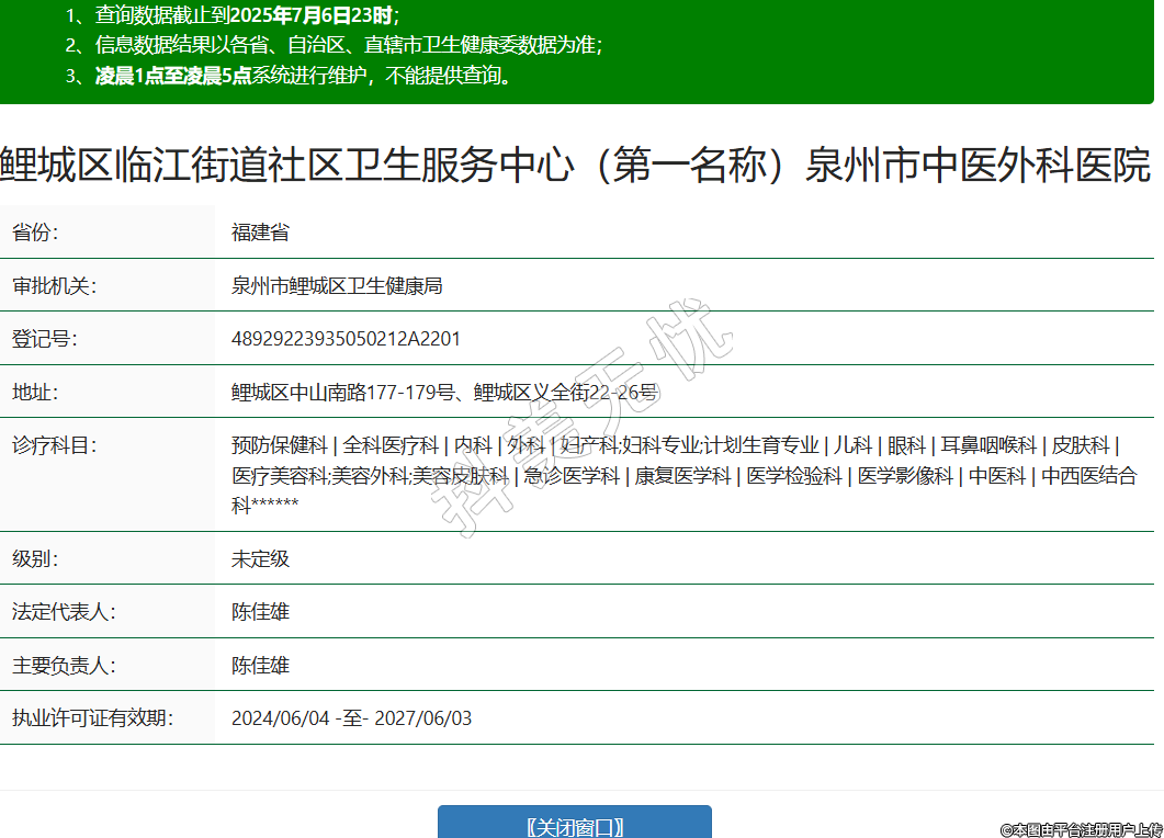 省份:福建省審批機關:泉州市鯉城區(qū)衛(wèi)生健康局登記號:48929223935050212A2201地址:鯉城區(qū)中山南路177-179號、鯉城區(qū)義全街22-26號診療科目:預防保健科 | 全科醫(yī)療科 | 內科 | 外科 | 婦產(chǎn)科;婦科專業(yè);計劃生育專業(yè) | 兒科 | 眼科 | 耳鼻咽喉科 | 皮膚科 | 醫(yī)療美容科;美容外科;美容皮膚科 | 急診醫(yī)學科 | 康復醫(yī)學科 | 醫(yī)學檢驗科 | 醫(yī)學影像科 | 中醫(yī)科 | 中西醫(yī)結合科******級別:未定級法定代表人:陳佳雄主要負責人:陳佳雄執(zhí)業(yè)許可證有效期:2024/06/04 -至- 2027/06/03 -