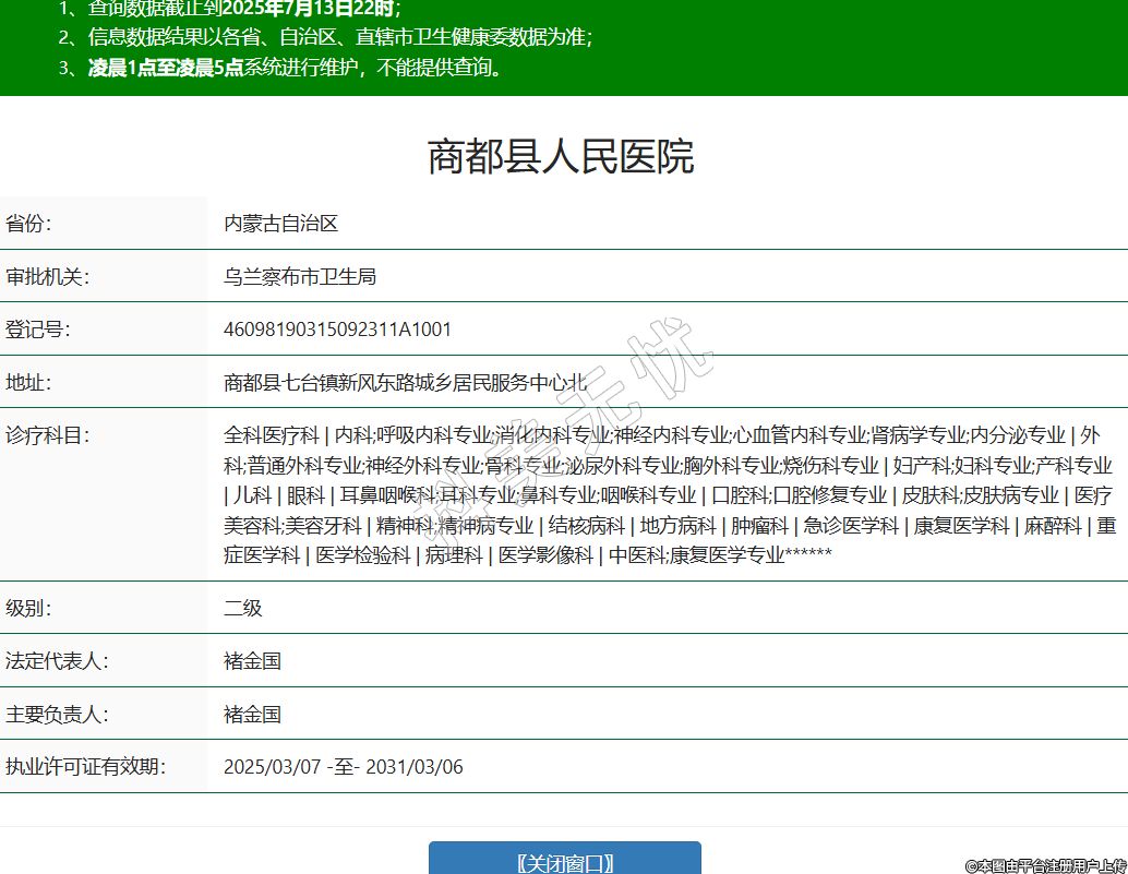 省份:內(nèi)蒙古自治區(qū)審批機(jī)關(guān):烏蘭察布市衛(wèi)生局登記號(hào):46098190315092311A1001地址:商都縣七臺(tái)鎮(zhèn)新風(fēng)東路城鄉(xiāng)居民服務(wù)中心北診療科目:全科醫(yī)療科 | 內(nèi)科;呼吸內(nèi)科專業(yè);消化內(nèi)科專業(yè);神經(jīng)內(nèi)科專業(yè);心血管內(nèi)科專業(yè);腎病學(xué)專業(yè);內(nèi)分泌專業(yè) | 外科;普通外科專業(yè);神經(jīng)外科專業(yè);骨科專業(yè);泌尿外科專業(yè);胸外科專業(yè);燒傷科專業(yè) | 婦產(chǎn)科;婦科專業(yè);產(chǎn)科專業(yè) | 兒科 | 眼科 | 耳鼻咽喉科;耳科專業(yè);鼻科專業(yè);咽喉科專業(yè) | 口腔科;口腔修復(fù)專業(yè) | 皮膚科;皮膚病專業(yè) | 醫(yī)療美容科;美容牙科 | 精神科;精神病專業(yè) | 結(jié)核病科 | 地方病科 | 腫瘤科 | 急診醫(yī)學(xué)科 | 康復(fù)醫(yī)學(xué)科 | 麻醉科 | 重癥醫(yī)學(xué)科 | 醫(yī)學(xué)檢驗(yàn)科 | 病理科 | 醫(yī)學(xué)影像科 | 中醫(yī)科;康復(fù)醫(yī)學(xué)專業(yè)******級(jí)別:二級(jí)法定代表人:褚金國(guó)主要負(fù)責(zé)人:褚金國(guó)執(zhí)業(yè)許可證有效期:2025/03/07 -至- 2031/03/06 -
