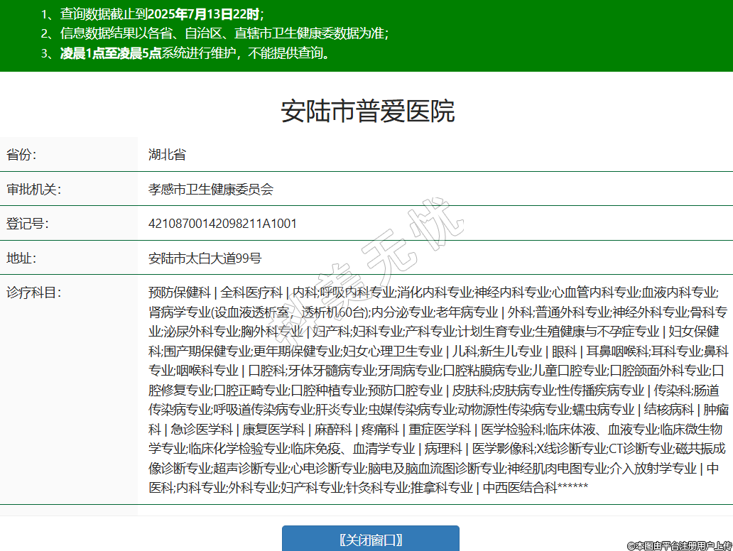 省份:湖北省審批機關:孝感市衛(wèi)生健康委員會登記號:42108700142098211A1001地址:安陸市太白大道99號診療科目:預防保健科 | 全科醫(yī)療科 | 內(nèi)科;呼吸內(nèi)科專業(yè);消化內(nèi)科專業(yè);神經(jīng)內(nèi)科專業(yè);心血管內(nèi)科專業(yè);血液內(nèi)科專業(yè);腎病學專業(yè)(設血液透析室,透析機60臺);內(nèi)分泌專業(yè);老年病專業(yè) | 外科;普通外科專業(yè);神經(jīng)外科專業(yè);骨科專業(yè);泌尿外科專業(yè);胸外科專業(yè) | 婦產(chǎn)科;婦科專業(yè);產(chǎn)科專業(yè);計劃生育專業(yè);生殖健康與不孕癥專業(yè) | 婦女保健科;圍產(chǎn)期保健專業(yè);更年期保健專業(yè);婦女心理衛(wèi)生專業(yè) | 兒科;新生兒專業(yè) | 眼科 | 耳鼻咽喉科;耳科專業(yè);鼻科專業(yè);咽喉科專業(yè) | 口腔科;牙體牙髓病專業(yè);牙周病專業(yè);口腔粘膜病專業(yè);兒童口腔專業(yè);口腔頜面外科專業(yè);口腔修復專業(yè);口腔正畸專業(yè);口腔種植專業(yè);預防口腔專業(yè) | 皮膚科;皮膚病專業(yè);性傳播疾病專業(yè) | 傳染科;腸道傳染病專業(yè);呼吸道傳染病專業(yè);肝炎專業(yè);蟲媒傳染病專業(yè);動物源性傳染病專業(yè);蠕蟲病專業(yè) | 結(jié)核病科 | 腫瘤科 | 急診醫(yī)學科 | 康復醫(yī)學科 | 麻醉科 | 疼痛科 | 重癥醫(yī)學科 | 醫(yī)學檢驗科;臨床體液、血液專業(yè);臨床微生物學專業(yè);臨床化學檢驗專業(yè);臨床免疫、血清學專業(yè) | 病理科 | 醫(yī)學影像科;X線診斷專業(yè);CT診斷專業(yè);磁共振成像診斷專業(yè);超聲診斷專業(yè);心電診斷專業(yè);腦電及腦血流圖診斷專業(yè);神經(jīng)肌肉電圖專業(yè);介入放射學專業(yè) | 中醫(yī)科;內(nèi)科專業(yè);外科專業(yè);婦產(chǎn)科專業(yè);針灸科專業(yè);推拿科專業(yè) | 中西醫(yī)結(jié)合科******級別:三級法定代表人:徐劍主要負責人:執(zhí)業(yè)許可證有效期:2012/03/02 -至- 2027/03/01 -