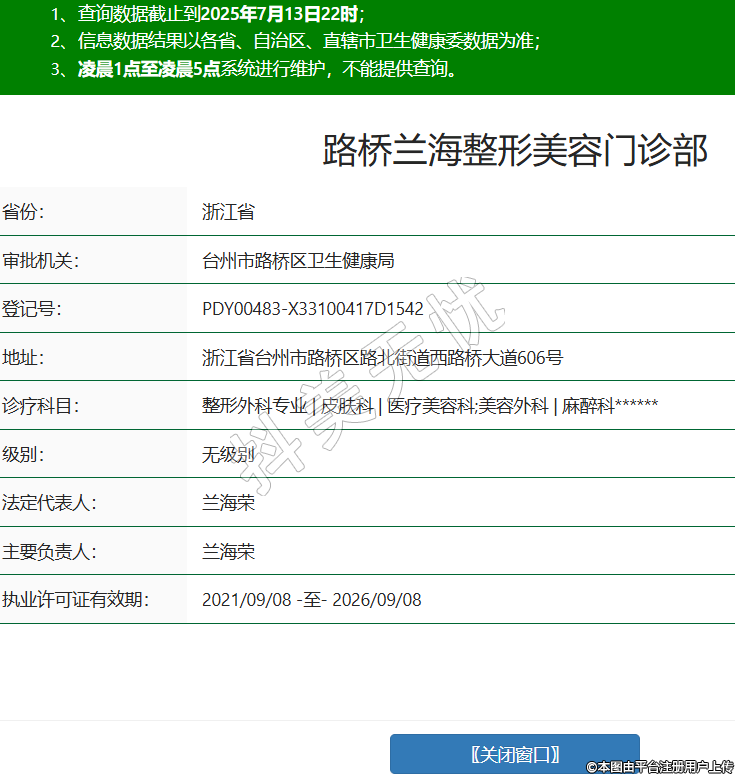 省份:浙江省審批機(jī)關(guān):臺州市路橋區(qū)衛(wèi)生健康局登記號:PDY00483-X33100417D1542地址:浙江省臺州市路橋區(qū)路北街道西路橋大道606號診療科目:整形外科專業(yè) | 皮膚科 | 醫(yī)療美容科;美容外科 | 麻醉科******級別:無級別法定代表人:蘭海榮主要負(fù)責(zé)人:蘭海榮執(zhí)業(yè)許可證有效期:2021/09/08 -至- 2026/09/08 -
