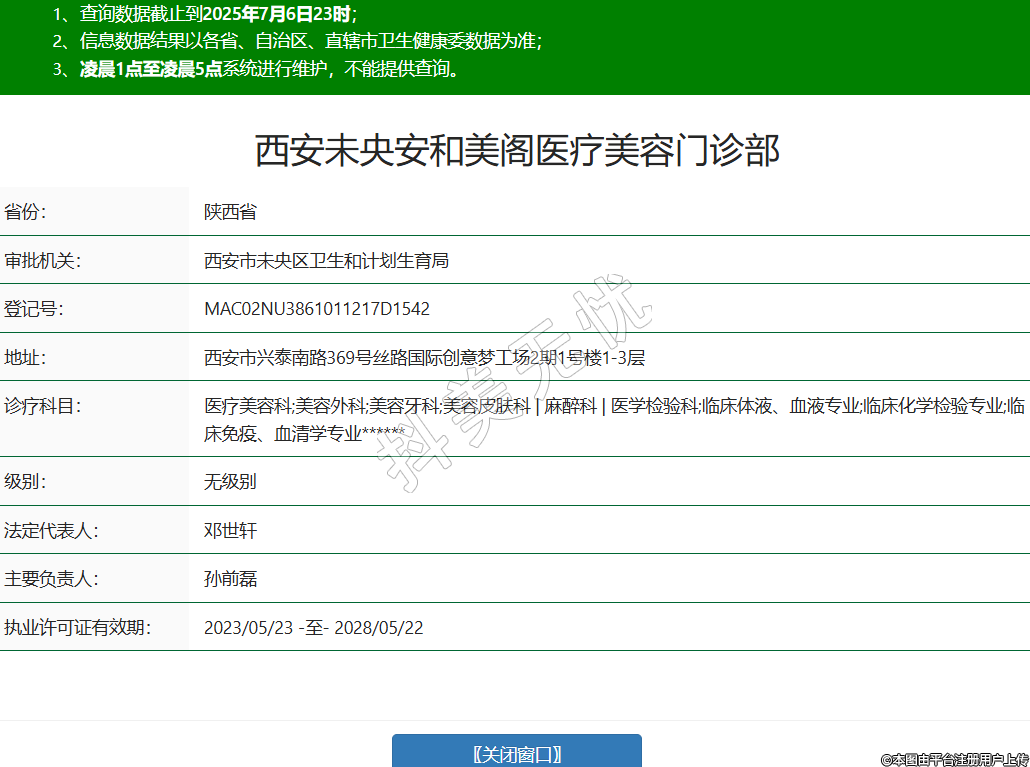 省份:陜西省審批機(jī)關(guān):西安市未央?yún)^(qū)衛(wèi)生和計劃生育局登記號:MAC02NU3861011217D1542地址:西安市興泰南路369號絲路國際創(chuàng)意夢工場2期1號樓1-3層診療科目:醫(yī)療美容科;美容外科;美容牙科;美容皮膚科 | 麻醉科 | 醫(yī)學(xué)檢驗(yàn)科;臨床體液、血液專業(yè);臨床化學(xué)檢驗(yàn)專業(yè);臨床免疫、血清學(xué)專業(yè)******級別:無級別法定代表人:鄧世軒主要負(fù)責(zé)人:孫前磊執(zhí)業(yè)許可證有效期:2023/05/23 -至- 2028/05/22 -