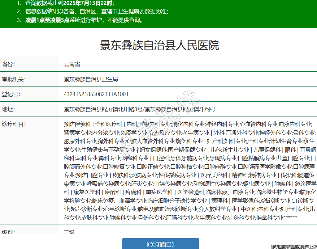 省份:云南省審批機關(guān):景東彝族自治縣衛(wèi)生局登記號:43241521853082311A1001地址:景東彝族自治縣錦屏鎮(zhèn)北川路8號/景東彝族自治縣錦屏鎮(zhèn)斗閣村診療科目:預(yù)防保健科 | 全科醫(yī)療科 | 內(nèi)科;呼吸內(nèi)科專業(yè);消化內(nèi)科專業(yè);神經(jīng)內(nèi)科專業(yè);心血管內(nèi)科專業(yè);血液內(nèi)科專業(yè);腎病學專業(yè);內(nèi)分泌專業(yè);免疫學專業(yè);變態(tài)反應(yīng)專業(yè);老年病專業(yè) | 外科;普通外科專業(yè);神經(jīng)外科專業(yè);骨科專業(yè);泌尿外科專業(yè);胸外科專業(yè);心臟大血管外科專業(yè);燒傷科專業(yè) | 婦產(chǎn)科;婦科專業(yè);產(chǎn)科專業(yè);計劃生育專業(yè);優(yōu)生學專業(yè);生殖健康與不孕癥專業(yè) | 婦女保健科;圍產(chǎn)期保健專業(yè) | 兒科;新生兒專業(yè) | 兒童保健科 | 眼科 | 耳鼻咽喉科;耳科專業(yè);鼻科專業(yè);咽喉科專業(yè) | 口腔科;牙體牙髓病專業(yè);牙周病專業(yè);口腔粘膜病專業(yè);兒童口腔專業(yè);口腔頜面外科專業(yè);口腔修復專業(yè);口腔正畸專業(yè);口腔種植專業(yè);口腔麻醉專業(yè);口腔頜面醫(yī)學影像專業(yè);口腔病理專業(yè);預(yù)防口腔專業(yè) | 皮膚科;皮膚病專業(yè);性傳播疾病專業(yè) | 醫(yī)療美容科 | 精神科;精神病專業(yè) | 傳染科;腸道傳染病專業(yè);呼吸道傳染病專業(yè);肝炎專業(yè);蟲媒傳染病專業(yè);動物源性傳染病專業(yè);蠕蟲病專業(yè) | 腫瘤科 | 急診醫(yī)學科 | 康復醫(yī)學科 | 麻醉科 | 疼痛科 | 重癥醫(yī)學科 | 醫(yī)學檢驗科;臨床體液、血液專業(yè);臨床微生物學專業(yè);臨床化學檢驗專業(yè);臨床免疫、血清學專業(yè);臨床細胞分子遺傳學專業(yè) | 病理科 | 醫(yī)學影像科;X線診斷專業(yè);CT診斷專業(yè);超聲診斷專業(yè);心電診斷專業(yè);腦電及腦血流圖診斷專業(yè);介入放射學專業(yè) | 中醫(yī)科;內(nèi)科專業(yè);婦產(chǎn)科專業(yè);兒科專業(yè);皮膚科專業(yè);腫瘤科專業(yè);骨傷科專業(yè);肛腸科專業(yè);老年病科專業(yè);針灸科專業(yè);推拿科專業(yè)******級別:二級法定代表人:馮周亮主要負責人:馮周亮執(zhí)業(yè)許可證有效期:2010/08/22 -至- 2025/08/21 -