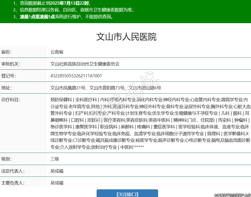 省份:云南省審批機(jī)關(guān):文山壯族苗族自治州衛(wèi)生健康委員會(huì)登記號(hào):43228550553262111A1001地址:文山市鳳凰路31號(hào)、文山市普陽(yáng)路73號(hào)、文山市團(tuán)山路6號(hào)診療科目:預(yù)防保健科 | 全科醫(yī)療科 | 內(nèi)科;呼吸內(nèi)科專業(yè);消化內(nèi)科專業(yè);神經(jīng)內(nèi)科專業(yè);心血管內(nèi)科專業(yè);腎病學(xué)專業(yè);內(nèi)分泌專業(yè);老年病專業(yè);其他 | 外科;普通外科專業(yè);神經(jīng)外科專業(yè);骨科專業(yè);泌尿外科專業(yè);胸外科專業(yè);心臟大血管外科專業(yè) | 婦產(chǎn)科;婦科專業(yè);產(chǎn)科專業(yè);計(jì)劃生育專業(yè);優(yōu)生學(xué)專業(yè);生殖健康與不孕癥專業(yè) | 兒科 | 眼科 | 耳鼻咽喉科 | 口腔科 | 皮膚科 | 醫(yī)療美容科;美容皮膚科;美容中醫(yī)科 | 精神科(門(mén)診、住院部) | 傳染科 | 腫瘤科 | 急診醫(yī)學(xué)科 | 康復(fù)醫(yī)學(xué)科 | 職業(yè)病科 | 麻醉科 | 疼痛科 | 重癥醫(yī)學(xué)科 | 醫(yī)學(xué)檢驗(yàn)科;臨床體液、血液專業(yè);臨床微生物學(xué)專業(yè);臨床化學(xué)檢驗(yàn)專業(yè);臨床免疫、血清學(xué)專業(yè);臨床細(xì)胞分子遺傳學(xué)專業(yè) | 病理科 | 醫(yī)學(xué)影像科;X線診斷專業(yè);CT診斷專業(yè);磁共振成像診斷專業(yè);核醫(yī)學(xué)專業(yè);超聲診斷專業(yè);心電診斷專業(yè);腦電及腦血流圖診斷專業(yè);介入放射學(xué)專業(yè);放射治療專業(yè) | 中醫(yī)科******級(jí)別:三級(jí)法定代表人:吳成福主要負(fù)責(zé)人:吳成福執(zhí)業(yè)許可證有效期:2024/12/23 -至- 2035/11/26 -