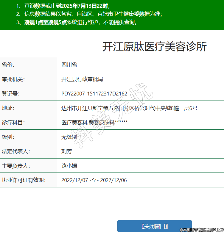 省份:四川省審批機關(guān):開江縣行政審批局登記號:PDY22007-151172317D2162地址:達州市開江縣新寧鎮(zhèn)五路口片區(qū)僑興時代中央城8幢一層6號診療科目:醫(yī)療美容科;美容皮膚科******級別:無級別法定代表人:劉芳主要負責人:路小娟執(zhí)業(yè)許可證有效期:2022/12/07 -至- 2027/12/06 -