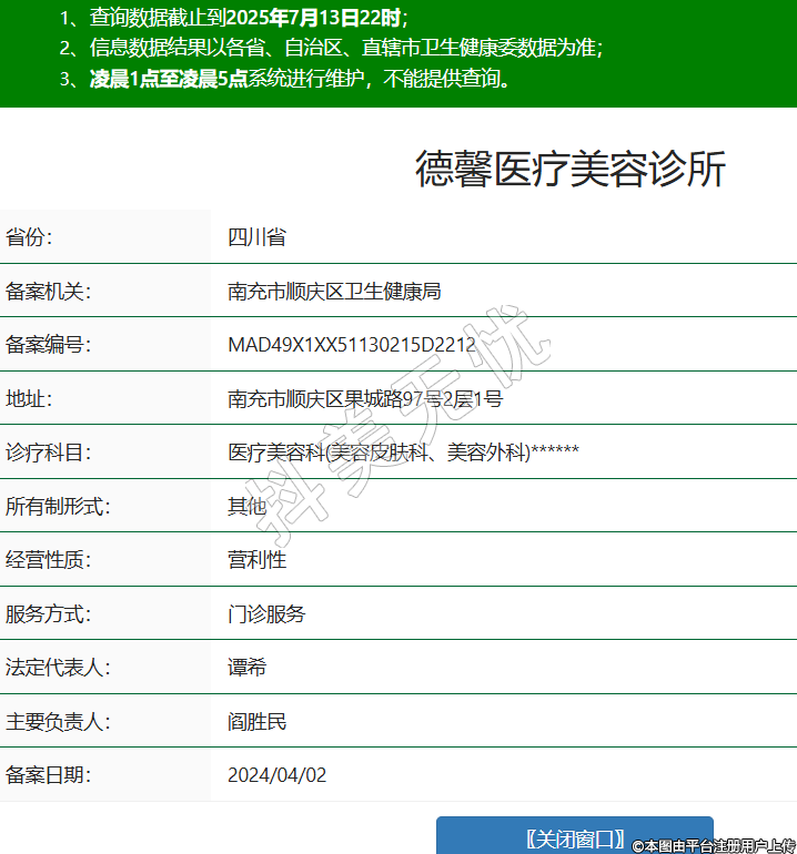 省份:四川省備案機(jī)關(guān):南充市順慶區(qū)衛(wèi)生健康局備案編號(hào):MAD49X1XX51130215D2212地址:南充市順慶區(qū)果城路97號(hào)2層1號(hào)診療科目:醫(yī)療美容科(美容皮膚科、美容外科)******所有制形式:其他經(jīng)營(yíng)性質(zhì):營(yíng)利性服務(wù)方式:門診服務(wù)法定代表人:譚希主要負(fù)責(zé)人:閻勝民備案日期:2024/04/02 -