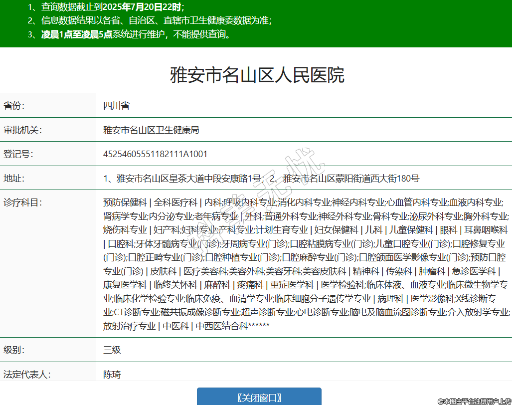 省份:四川省審批機關(guān):雅安市名山區(qū)衛(wèi)生健康局登記號:45254605551182111A1001地址:1、雅安市名山區(qū)皇茶大道中段安康路1號;2、雅安市名山區(qū)蒙陽街道西大街180號診療科目:預(yù)防保健科 | 全科醫(yī)療科 | 內(nèi)科;呼吸內(nèi)科專業(yè);消化內(nèi)科專業(yè);神經(jīng)內(nèi)科專業(yè);心血管內(nèi)科專業(yè);血液內(nèi)科專業(yè);腎病學(xué)專業(yè);內(nèi)分泌專業(yè);老年病專業(yè) | 外科;普通外科專業(yè);神經(jīng)外科專業(yè);骨科專業(yè);泌尿外科專業(yè);胸外科專業(yè);燒傷科專業(yè) | 婦產(chǎn)科;婦科專業(yè);產(chǎn)科專業(yè);計劃生育專業(yè) | 婦女保健科 | 兒科 | 兒童保健科 | 眼科 | 耳鼻咽喉科 | 口腔科;牙體牙髓病專業(yè)(門診);牙周病專業(yè)(門診);口腔粘膜病專業(yè)(門診);兒童口腔專業(yè)(門診);口腔修復(fù)專業(yè)(門診);口腔正畸專業(yè)(門診);口腔種植專業(yè)(門診);口腔麻醉專業(yè)(門診);口腔頜面醫(yī)學(xué)影像專業(yè)(門診);預(yù)防口腔專業(yè)(門診) | 皮膚科 | 醫(yī)療美容科;美容外科;美容牙科;美容皮膚科 | 精神科 | 傳染科 | 腫瘤科 | 急診醫(yī)學(xué)科 | 康復(fù)醫(yī)學(xué)科 | 臨終關(guān)懷科 | 麻醉科 | 疼痛科 | 重癥醫(yī)學(xué)科 | 醫(yī)學(xué)檢驗科;臨床體液、血液專業(yè);臨床微生物學(xué)專業(yè);臨床化學(xué)檢驗專業(yè);臨床免疫、血清學(xué)專業(yè);臨床細(xì)胞分子遺傳學(xué)專業(yè) | 病理科 | 醫(yī)學(xué)影像科;X線診斷專業(yè);CT診斷專業(yè);磁共振成像診斷專業(yè);超聲診斷專業(yè);心電診斷專業(yè);腦電及腦血流圖診斷專業(yè);介入放射學(xué)專業(yè);放射治療專業(yè) | 中醫(yī)科 | 中西醫(yī)結(jié)合科******級別:三級法定代表人:陳琦主要負(fù)責(zé)人:陳琦執(zhí)業(yè)許可證有效期:2020/08/07 -至- 2035/08/06 -