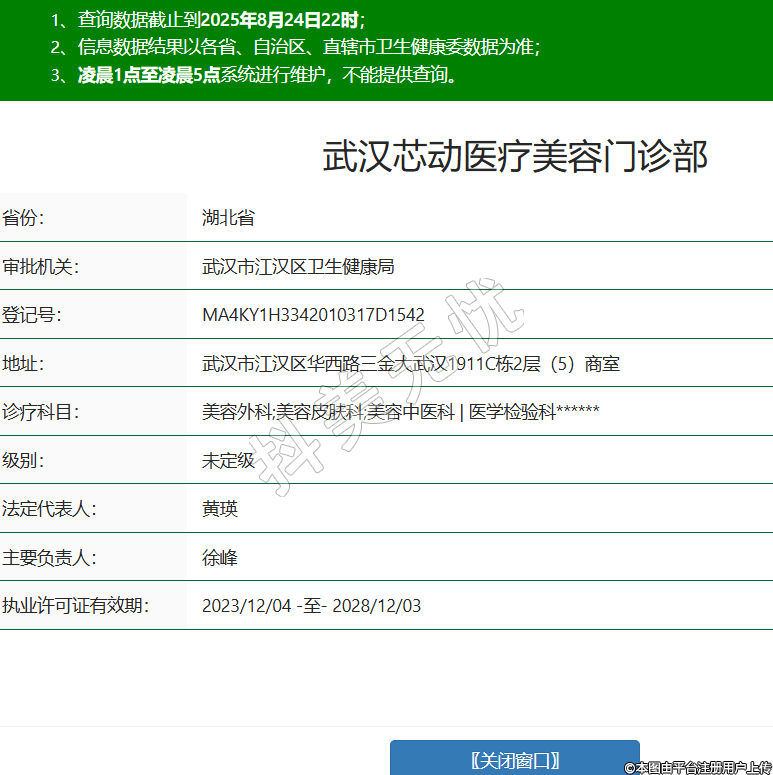 省份:湖北省審批機(jī)關(guān):武漢市江漢區(qū)衛(wèi)生健康局登記號(hào):MA4KY1H3342010317D1542地址:武漢市江漢區(qū)華西路三金大武漢1911C棟2層(5)商室診療科目:美容外科;美容皮膚科;美容中醫(yī)科 | 醫(yī)學(xué)檢驗(yàn)科******級(jí)別:未定級(jí)法定代表人:黃瑛主要負(fù)責(zé)人:徐峰執(zhí)業(yè)許可證有效期:2023/12/04 -至- 2028/12/03 -