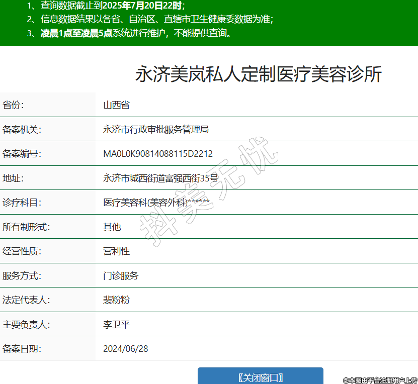 省份:山西省備案機(jī)關(guān):永濟(jì)市行政審批服務(wù)管理局備案編號(hào):MA0L0K90814088115D2212地址:永濟(jì)市城西街道富強(qiáng)西街35號(hào)診療科目:醫(yī)療美容科(美容外科)******所有制形式:其他經(jīng)營性質(zhì):營利性服務(wù)方式:門診服務(wù)法定代表人:裴粉粉主要負(fù)責(zé)人:李衛(wèi)平備案日期:2024/06/28 -