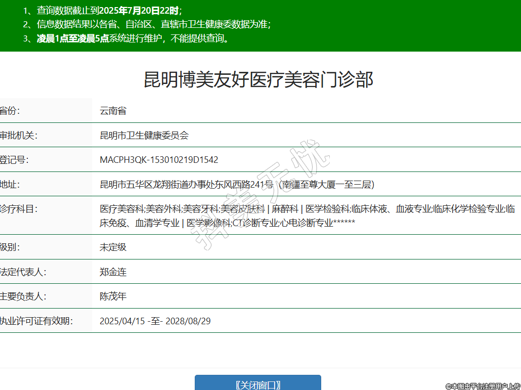 省份:云南省審批機關:昆明市衛(wèi)生健康委員會登記號:MACPH3QK-153010219D1542地址:昆明市五華區(qū)龍翔街道辦事處東風西路241號(南疆至尊大廈一至三層)診療科目:醫(yī)療美容科;美容外科;美容牙科;美容皮膚科 | 麻醉科 | 醫(yī)學檢驗科;臨床體液、血液專業(yè);臨床化學檢驗專業(yè);臨床免疫、血清學專業(yè) | 醫(yī)學影像科;CT診斷專業(yè);心電診斷專業(yè)******級別:未定級法定代表人:鄭金連主要負責人:陳茂年執(zhí)業(yè)許可證有效期:2025/04/15 -至- 2028/08/29 -