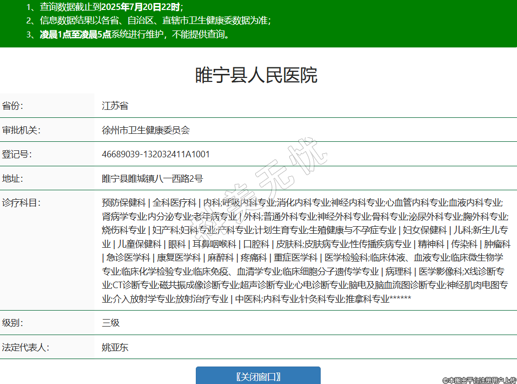 省份:江蘇省審批機關(guān):徐州市衛(wèi)生健康委員會登記號:46689039-132032411A1001地址:睢寧縣睢城鎮(zhèn)八一西路2號診療科目:預(yù)防保健科 | 全科醫(yī)療科 | 內(nèi)科;呼吸內(nèi)科專業(yè);消化內(nèi)科專業(yè);神經(jīng)內(nèi)科專業(yè);心血管內(nèi)科專業(yè);血液內(nèi)科專業(yè);腎病學(xué)專業(yè);內(nèi)分泌專業(yè);老年病專業(yè) | 外科;普通外科專業(yè);神經(jīng)外科專業(yè);骨科專業(yè);泌尿外科專業(yè);胸外科專業(yè);燒傷科專業(yè) | 婦產(chǎn)科;婦科專業(yè);產(chǎn)科專業(yè);計劃生育專業(yè);生殖健康與不孕癥專業(yè) | 婦女保健科 | 兒科;新生兒專業(yè) | 兒童保健科 | 眼科 | 耳鼻咽喉科 | 口腔科 | 皮膚科;皮膚病專業(yè);性傳播疾病專業(yè) | 精神科 | 傳染科 | 腫瘤科 | 急診醫(yī)學(xué)科 | 康復(fù)醫(yī)學(xué)科 | 麻醉科 | 疼痛科 | 重癥醫(yī)學(xué)科 | 醫(yī)學(xué)檢驗科;臨床體液、血液專業(yè);臨床微生物學(xué)專業(yè);臨床化學(xué)檢驗專業(yè);臨床免疫、血清學(xué)專業(yè);臨床細胞分子遺傳學(xué)專業(yè) | 病理科 | 醫(yī)學(xué)影像科;X線診斷專業(yè);CT診斷專業(yè);磁共振成像診斷專業(yè);超聲診斷專業(yè);心電診斷專業(yè);腦電及腦血流圖診斷專業(yè);神經(jīng)肌肉電圖專業(yè);介入放射學(xué)專業(yè);放射治療專業(yè) | 中醫(yī)科;內(nèi)科專業(yè);針灸科專業(yè);推拿科專業(yè)******級別:三級法定代表人:姚亞東主要負責(zé)人:姚亞東執(zhí)業(yè)許可證有效期:2019/12/16 -至- 2034/12/15 -