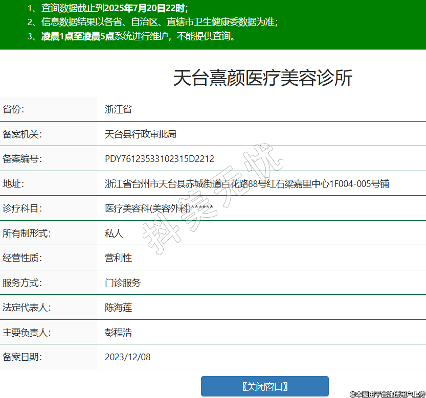 省份:浙江省備案機關(guān):天臺縣行政審批局備案編號:PDY76123533102315D2212地址:浙江省臺州市天臺縣赤城街道百花路88號紅石梁嘉里中心1F004-005號鋪診療科目:醫(yī)療美容科(美容外科)******所有制形式:私人經(jīng)營性質(zhì):營利性服務(wù)方式:門診服務(wù)法定代表人:陳海蓮主要負責(zé)人:彭程浩備案日期:2023/12/08 -