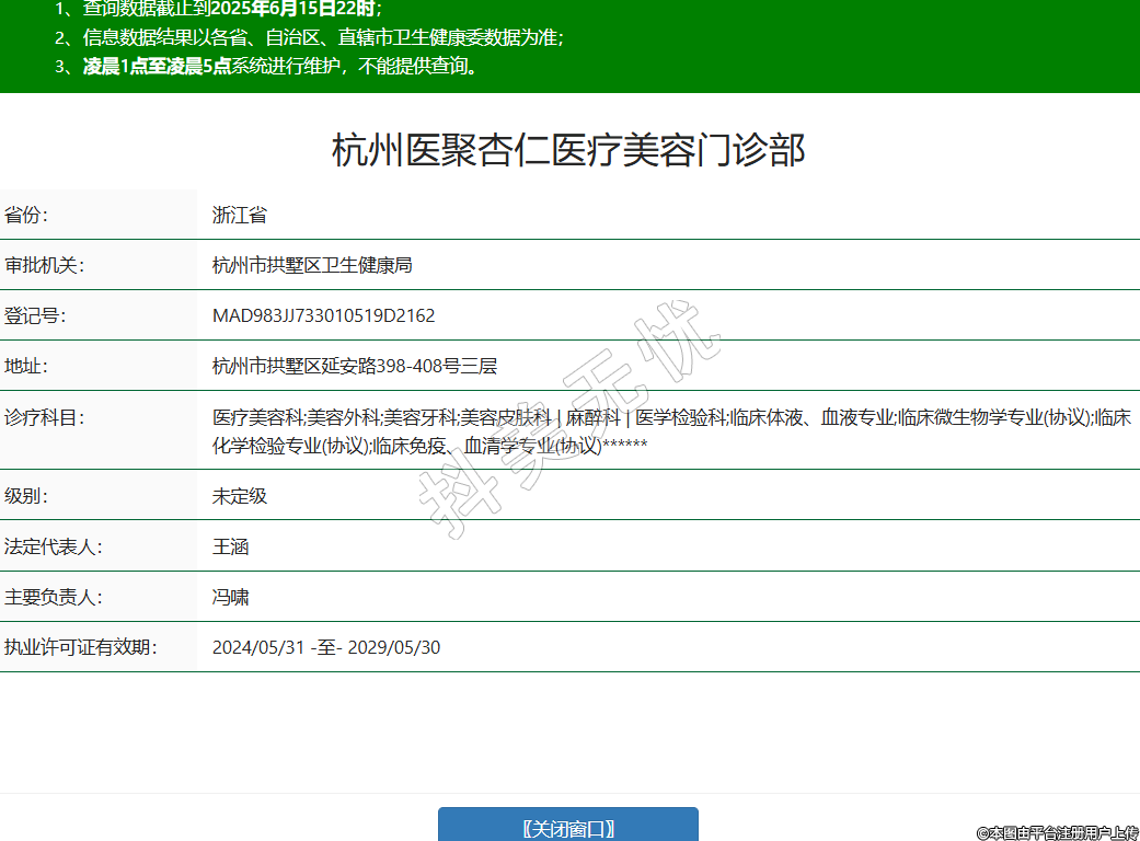 省份:浙江省審批機(jī)關(guān):杭州市拱墅區(qū)衛(wèi)生健康局登記號:MAD983JJ733010519D2162地址:杭州市拱墅區(qū)延安路398-408號三層診療科目:醫(yī)療美容科;美容外科;美容牙科;美容皮膚科 | 麻醉科 | 醫(yī)學(xué)檢驗科;臨床體液、血液專業(yè);臨床微生物學(xué)專業(yè)(協(xié)議);臨床化學(xué)檢驗專業(yè)(協(xié)議);臨床免疫、血清學(xué)專業(yè)(協(xié)議)******級別:未定級法定代表人:王涵主要負(fù)責(zé)人:馮嘯執(zhí)業(yè)許可證有效期:2024/05/31 -至- 2029/05/30 -