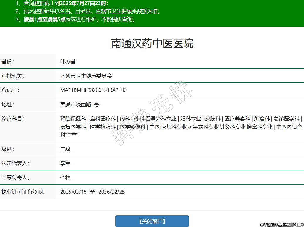 省份:江蘇省審批機關:南通市衛(wèi)生健康委員會登記號:MA1TBMHE832061313A2102地址:南通市濠西路1號診療科目:預防保健科 | 全科醫(yī)療科 | 內科 | 外科;普通外科專業(yè) | 婦科專業(yè) | 皮膚科 | 醫(yī)療美容科 | 腫瘤科 | 急診醫(yī)學科 | 康復醫(yī)學科 | 醫(yī)學檢驗科 | 醫(yī)學影像科 | 中醫(yī)科;兒科專業(yè);老年病科專業(yè);針灸科專業(yè);推拿科專業(yè) | 中西醫(yī)結合科******級別:二級法定代表人:李軍主要負責人:李林執(zhí)業(yè)許可證有效期:2025/03/18 -至- 2036/02/25 -