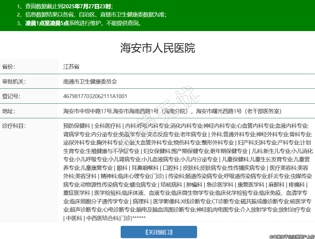 省份:江蘇省審批機(jī)關(guān):南通市衛(wèi)生健康委員會(huì)登記號(hào):46798177032062111A1001地址:海安市中壩中路17號(hào),海安市海南西路1號(hào)(海南分院),海安市曙光西路1號(hào)(老干部醫(yī)務(wù)室)診療科目:預(yù)防保健科 | 全科醫(yī)療科 | 內(nèi)科;呼吸內(nèi)科專業(yè);消化內(nèi)科專業(yè);神經(jīng)內(nèi)科專業(yè);心血管內(nèi)科專業(yè);血液內(nèi)科專業(yè);腎病學(xué)專業(yè);內(nèi)分泌專業(yè);免疫學(xué)專業(yè);變態(tài)反應(yīng)專業(yè);老年病專業(yè) | 外科;普通外科專業(yè);神經(jīng)外科專業(yè);骨科專業(yè);泌尿外科專業(yè);胸外科專業(yè);心臟大血管外科專業(yè);燒傷科專業(yè);整形外科專業(yè) | 婦產(chǎn)科;婦科專業(yè);產(chǎn)科專業(yè);計(jì)劃生育專業(yè);生殖健康與不孕癥專業(yè) | 婦女保健科;圍產(chǎn)期保健專業(yè);更年期保健專業(yè) | 兒科;新生兒專業(yè);小兒消化專業(yè);小兒呼吸專業(yè);小兒腎病專業(yè);小兒血液病專業(yè);小兒內(nèi)分泌專業(yè) | 兒童保健科;兒童生長(zhǎng)發(fā)育專業(yè);兒童營(yíng)養(yǎng)專業(yè);兒童康復(fù)專業(yè) | 眼科 | 耳鼻咽喉科 | 口腔科 | 皮膚科;皮膚病專業(yè);性傳播疾病專業(yè) | 醫(yī)療美容科;美容外科;美容牙科 | 精神科;臨床心理專業(yè)(門(mén)診) | 傳染科;腸道傳染病專業(yè);呼吸道傳染病專業(yè);肝炎專業(yè);蟲(chóng)媒傳染病專業(yè);動(dòng)物源性傳染病專業(yè);蠕蟲(chóng)病專業(yè) | 結(jié)核病科 | 腫瘤科 | 急診醫(yī)學(xué)科 | 康復(fù)醫(yī)學(xué)科 | 麻醉科 | 疼痛科 | 重癥醫(yī)學(xué)科 | 醫(yī)學(xué)檢驗(yàn)科;臨床體液、血液專業(yè);臨床微生物學(xué)專業(yè);臨床化學(xué)檢驗(yàn)專業(yè);臨床免疫、血清學(xué)專業(yè);臨床細(xì)胞分子遺傳學(xué)專業(yè) | 病理科 | 醫(yī)學(xué)影像科;X線診斷專業(yè);CT診斷專業(yè);磁共振成像診斷專業(yè);核醫(yī)學(xué)專業(yè);超聲診斷專業(yè);心電診斷專業(yè);腦電及腦血流圖診斷專業(yè);神經(jīng)肌肉電圖專業(yè);介入放射學(xué)專業(yè);放射治療專業(yè) | 中醫(yī)科 | 中西醫(yī)結(jié)合科(門(mén)診)******級(jí)別:三級(jí)法定代表人:吉華亮主要負(fù)責(zé)人:呂書(shū)軍執(zhí)業(yè)許可證有效期:2022/08/22 -至- 2036/03/19 -
