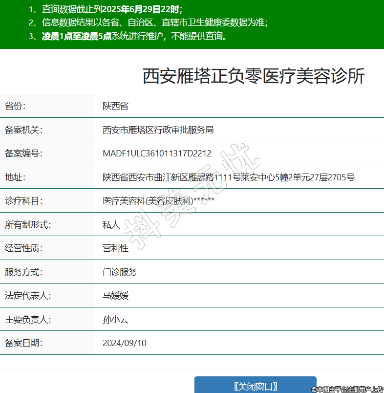 省份:陜西省備案機(jī)關(guān):西安市雁塔區(qū)行政審批服務(wù)局備案編號(hào):MADF1ULC361011317D2212地址:陜西省西安市曲江新區(qū)雁展路1111號(hào)萊安中心5幢2單元27層2705號(hào)診療科目:醫(yī)療美容科(美容皮膚科)******所有制形式:私人經(jīng)營(yíng)性質(zhì):營(yíng)利性服務(wù)方式:門(mén)診服務(wù)法定代表人:馬媛媛主要負(fù)責(zé)人:孫小云備案日期:2024/09/10 -