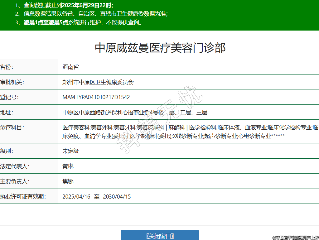省份:河南省審批機(jī)關(guān):鄭州市中原區(qū)衛(wèi)生健康委員會登記號:MA9LLYPA041010217D1542地址:中原區(qū)中原西路街道保利心語商業(yè)街4號樓一層、二層、三層診療科目:醫(yī)療美容科;美容外科;美容牙科;美容皮膚科 | 麻醉科 | 醫(yī)學(xué)檢驗(yàn)科;臨床體液、血液專業(yè);臨床化學(xué)檢驗(yàn)專業(yè);臨床免疫、血清學(xué)專業(yè)(委托) | 醫(yī)學(xué)影像科(委托);X線診斷專業(yè);超聲診斷專業(yè);心電診斷專業(yè)******級別:未定級法定代表人:黃琳主要負(fù)責(zé)人:焦娜執(zhí)業(yè)許可證有效期:2025/04/16 -至- 2030/04/15 -