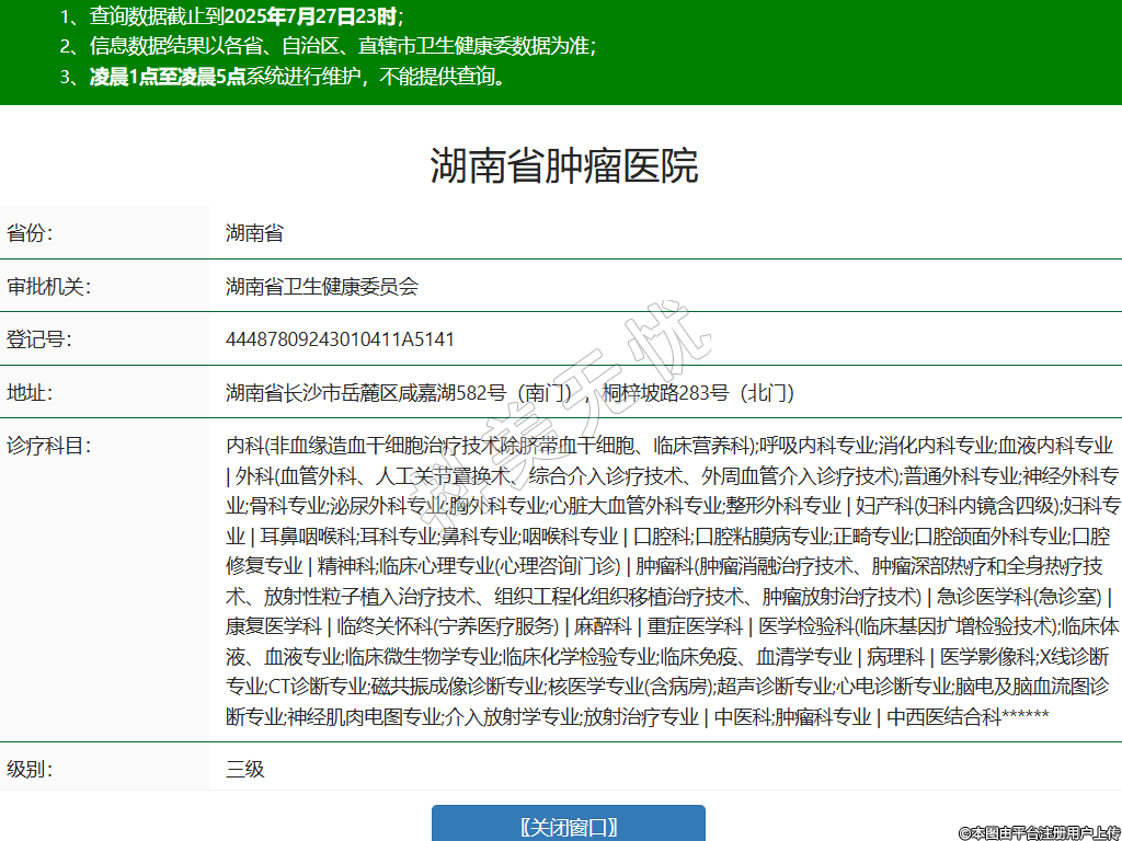 省份:湖南省審批機(jī)關(guān):湖南省衛(wèi)生健康委員會(huì)登記號(hào):44487809243010411A5141地址:湖南省長(zhǎng)沙市岳麓區(qū)咸嘉湖582號(hào)(南門),桐梓坡路283號(hào)(北門)診療科目:內(nèi)科(非血緣造血干細(xì)胞治療技術(shù)除臍帶血干細(xì)胞、臨床營(yíng)養(yǎng)科);呼吸內(nèi)科專業(yè);消化內(nèi)科專業(yè);血液內(nèi)科專業(yè) | 外科(血管外科、人工關(guān)節(jié)置換術(shù)、綜合介入診療技術(shù)、外周血管介入診療技術(shù));普通外科專業(yè);神經(jīng)外科專業(yè);骨科專業(yè);泌尿外科專業(yè);胸外科專業(yè);心臟大血管外科專業(yè);整形外科專業(yè) | 婦產(chǎn)科(婦科內(nèi)鏡含四級(jí));婦科專業(yè) | 耳鼻咽喉科;耳科專業(yè);鼻科專業(yè);咽喉科專業(yè) | 口腔科;口腔粘膜病專業(yè);正畸專業(yè);口腔頜面外科專業(yè);口腔修復(fù)專業(yè) | 精神科;臨床心理專業(yè)(心理咨詢門診) | 腫瘤科(腫瘤消融治療技術(shù)、腫瘤深部熱療和全身熱療技術(shù)、放射性粒子植入治療技術(shù)、組織工程化組織移植治療技術(shù)、腫瘤放射治療技術(shù)) | 急診醫(yī)學(xué)科(急診室) | 康復(fù)醫(yī)學(xué)科 | 臨終關(guān)懷科(寧養(yǎng)醫(yī)療服務(wù)) | 麻醉科 | 重癥醫(yī)學(xué)科 | 醫(yī)學(xué)檢驗(yàn)科(臨床基因擴(kuò)增檢驗(yàn)技術(shù));臨床體液、血液專業(yè);臨床微生物學(xué)專業(yè);臨床化學(xué)檢驗(yàn)專業(yè);臨床免疫、血清學(xué)專業(yè) | 病理科 | 醫(yī)學(xué)影像科;X線診斷專業(yè);CT診斷專業(yè);磁共振成像診斷專業(yè);核醫(yī)學(xué)專業(yè)(含病房);超聲診斷專業(yè);心電診斷專業(yè);腦電及腦血流圖診斷專業(yè);神經(jīng)肌肉電圖專業(yè);介入放射學(xué)專業(yè);放射治療專業(yè) | 中醫(yī)科;腫瘤科專業(yè) | 中西醫(yī)結(jié)合科******級(jí)別:三級(jí)法定代表人:向華主要負(fù)責(zé)人:向華執(zhí)業(yè)許可證有效期:2019/08/20 -至- 2034/08/20 -