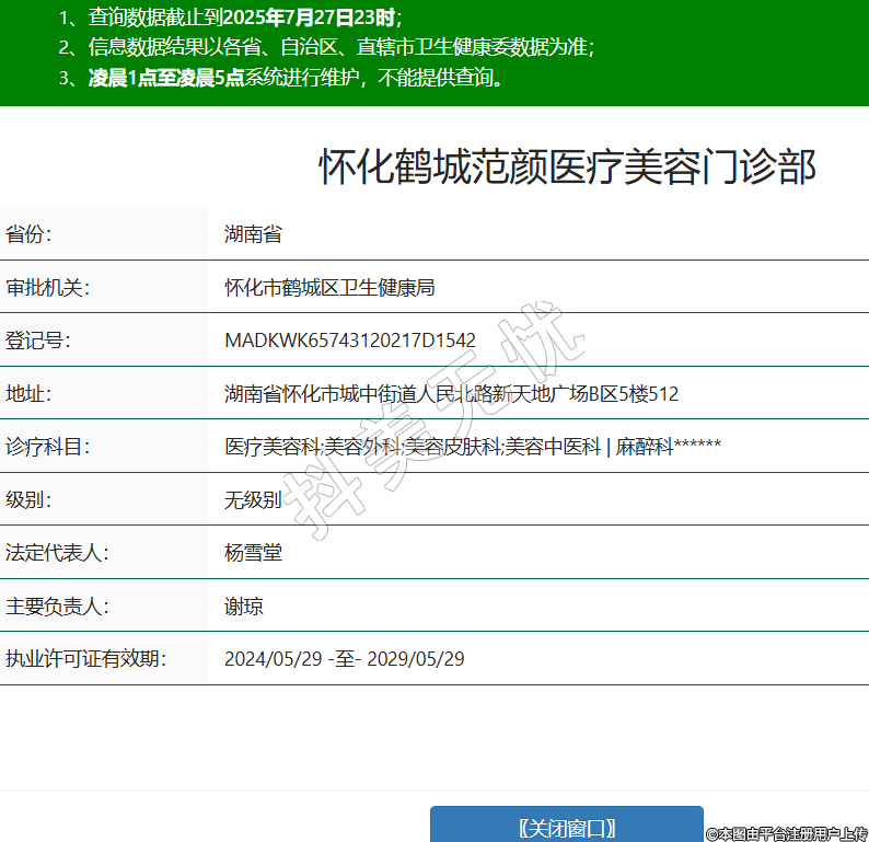 省份:湖南省審批機(jī)關(guān):懷化市鶴城區(qū)衛(wèi)生健康局登記號(hào):MADKWK65743120217D1542地址:湖南省懷化市城中街道人民北路新天地廣場(chǎng)B區(qū)5樓512診療科目:醫(yī)療美容科;美容外科;美容皮膚科;美容中醫(yī)科 | 麻醉科******級(jí)別:無(wú)級(jí)別法定代表人:楊雪堂主要負(fù)責(zé)人:謝瓊執(zhí)業(yè)許可證有效期:2024/05/29 -至- 2029/05/29 -