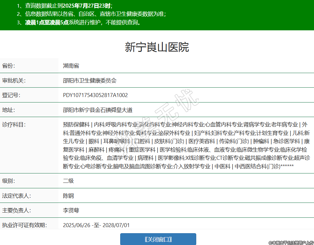 省份:湖南省審批機(jī)關(guān):邵陽(yáng)市衛(wèi)生健康委員會(huì)登記號(hào):PDY10717543052817A1002地址:邵陽(yáng)市新寧縣金石鎮(zhèn)舜皇大道診療科目:預(yù)防保健科 | 內(nèi)科;呼吸內(nèi)科專業(yè);消化內(nèi)科專業(yè);神經(jīng)內(nèi)科專業(yè);心血管內(nèi)科專業(yè);腎病學(xué)專業(yè);老年病專業(yè) | 外科;普通外科專業(yè);神經(jīng)外科專業(yè);骨科專業(yè);泌尿外科專業(yè) | 婦產(chǎn)科;婦科專業(yè);產(chǎn)科專業(yè);計(jì)劃生育專業(yè) | 兒科;新生兒專業(yè) | 眼科 | 耳鼻咽喉科 | 口腔科 | 皮膚科(門診) | 醫(yī)療美容科 | 傳染科(門診) | 腫瘤科 | 急診醫(yī)學(xué)科 | 康復(fù)醫(yī)學(xué)科 | 麻醉科 | 疼痛科 | 重癥醫(yī)學(xué)科 | 醫(yī)學(xué)檢驗(yàn)科;臨床體液、血液專業(yè);臨床微生物學(xué)專業(yè);臨床化學(xué)檢驗(yàn)專業(yè);臨床免疫、血清學(xué)專業(yè) | 病理科 | 醫(yī)學(xué)影像科;X線診斷專業(yè);CT診斷專業(yè);磁共振成像診斷專業(yè);超聲診斷專業(yè);心電診斷專業(yè);腦電及腦血流圖診斷專業(yè);介入放射學(xué)專業(yè) | 中醫(yī)科 | 中西醫(yī)結(jié)合科(門診)******級(jí)別:二級(jí)法定代表人:陳鋼主要負(fù)責(zé)人:李賢萼 -