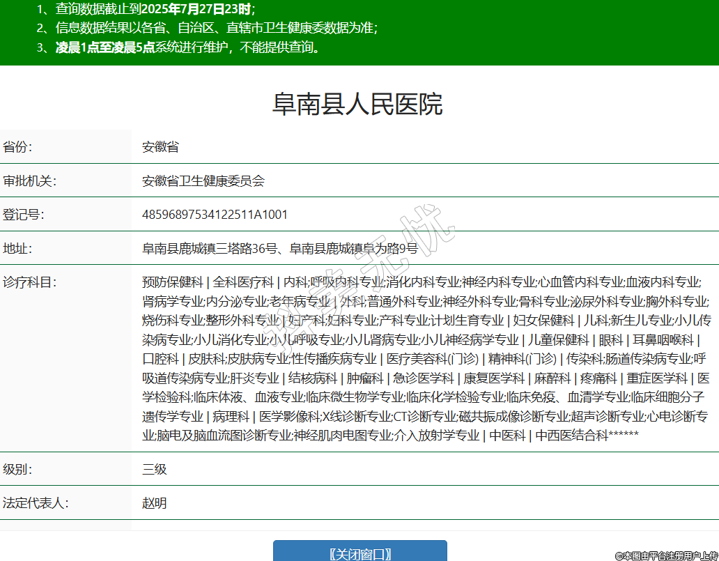 省份:安徽省審批機(jī)關(guān):安徽省衛(wèi)生健康委員會(huì)登記號(hào):48596897534122511A1001地址:阜南縣鹿城鎮(zhèn)三塔路36號(hào)、阜南縣鹿城鎮(zhèn)阜為路9號(hào)診療科目:預(yù)防保健科 | 全科醫(yī)療科 | 內(nèi)科;呼吸內(nèi)科專業(yè);消化內(nèi)科專業(yè);神經(jīng)內(nèi)科專業(yè);心血管內(nèi)科專業(yè);血液內(nèi)科專業(yè);腎病學(xué)專業(yè);內(nèi)分泌專業(yè);老年病專業(yè) | 外科;普通外科專業(yè);神經(jīng)外科專業(yè);骨科專業(yè);泌尿外科專業(yè);胸外科專業(yè);燒傷科專業(yè);整形外科專業(yè) | 婦產(chǎn)科;婦科專業(yè);產(chǎn)科專業(yè);計(jì)劃生育專業(yè) | 婦女保健科 | 兒科;新生兒專業(yè);小兒傳染病專業(yè);小兒消化專業(yè);小兒呼吸專業(yè);小兒腎病專業(yè);小兒神經(jīng)病學(xué)專業(yè) | 兒童保健科 | 眼科 | 耳鼻咽喉科 | 口腔科 | 皮膚科;皮膚病專業(yè);性傳播疾病專業(yè) | 醫(yī)療美容科(門(mén)診) | 精神科(門(mén)診) | 傳染科;腸道傳染病專業(yè);呼吸道傳染病專業(yè);肝炎專業(yè) | 結(jié)核病科 | 腫瘤科 | 急診醫(yī)學(xué)科 | 康復(fù)醫(yī)學(xué)科 | 麻醉科 | 疼痛科 | 重癥醫(yī)學(xué)科 | 醫(yī)學(xué)檢驗(yàn)科;臨床體液、血液專業(yè);臨床微生物學(xué)專業(yè);臨床化學(xué)檢驗(yàn)專業(yè);臨床免疫、血清學(xué)專業(yè);臨床細(xì)胞分子遺傳學(xué)專業(yè) | 病理科 | 醫(yī)學(xué)影像科;X線診斷專業(yè);CT診斷專業(yè);磁共振成像診斷專業(yè);超聲診斷專業(yè);心電診斷專業(yè);腦電及腦血流圖診斷專業(yè);神經(jīng)肌肉電圖專業(yè);介入放射學(xué)專業(yè) | 中醫(yī)科 | 中西醫(yī)結(jié)合科******級(jí)別:三級(jí)法定代表人:趙明主要負(fù)責(zé)人:趙明執(zhí)業(yè)許可證有效期:2020/04/21 -至- 2035/04/20 -