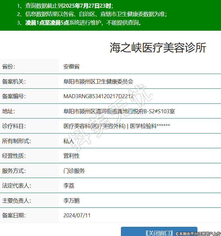 省份:安徽省備案機關:阜陽市潁州區(qū)衛(wèi)生健康委員會備案編號:MAD3RNGB534120217D2212地址:阜陽市潁州區(qū)清河街道置地百悅府B-S2#S103室診療科目:醫(yī)療美容科(醫(yī)療美容外科) | 醫(yī)學檢驗科******所有制形式:私人經(jīng)營性質(zhì):營利性服務方式:門診服務法定代表人:李荔主要負責人:李萬鵬備案日期:2024/07/11 -