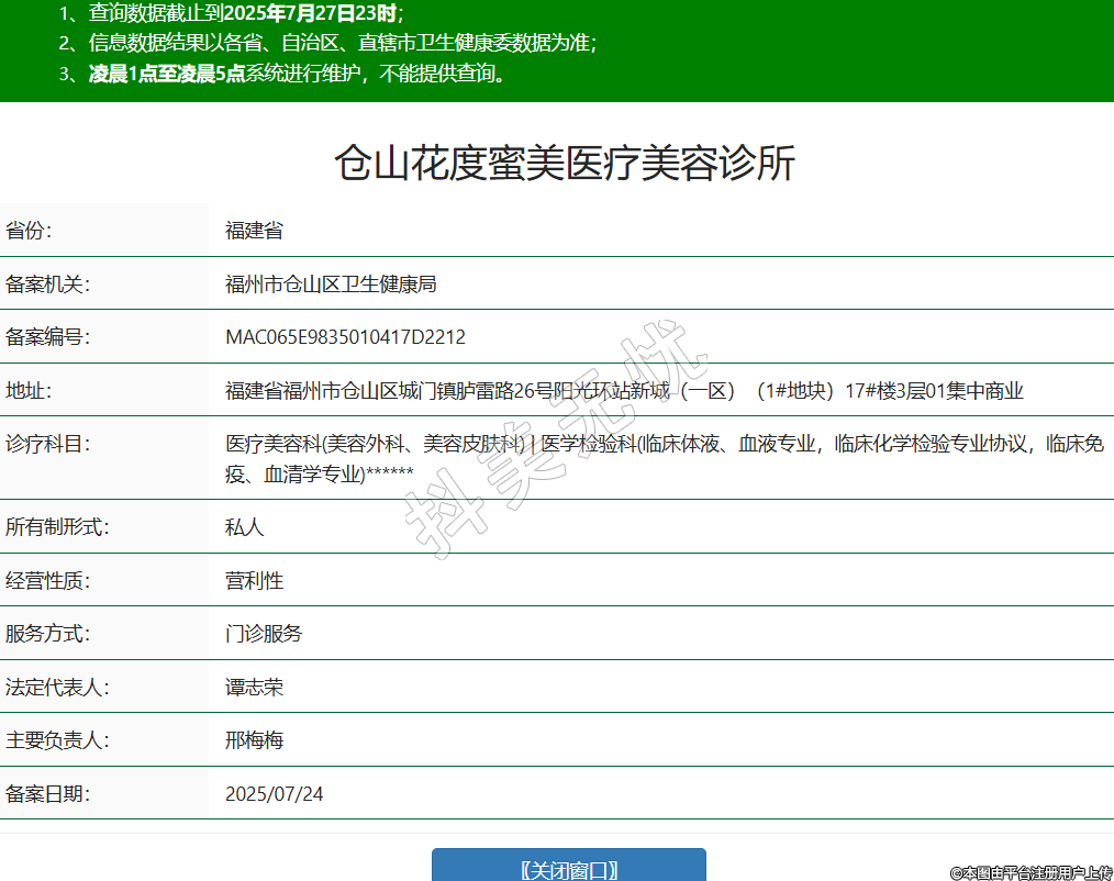 省份:福建省備案機關(guān):福州市倉山區(qū)衛(wèi)生健康局備案編號:MAC065E9835010417D2212地址:福建省福州市倉山區(qū)城門鎮(zhèn)臚雷路26號陽光環(huán)站新城(一區(qū))(1#地塊)17#樓3層01集中商業(yè)診療科目:醫(yī)療美容科(美容外科、美容皮膚科) | 醫(yī)學(xué)檢驗科(臨床體液、血液專業(yè),臨床化學(xué)檢驗專業(yè)協(xié)議,臨床免疫、血清學(xué)專業(yè))******所有制形式:私人經(jīng)營性質(zhì):營利性服務(wù)方式:門診服務(wù)法定代表人:譚志榮主要負(fù)責(zé)人:邢梅梅備案日期:2025/07/24 -