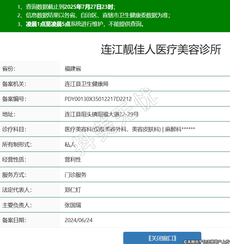 省份:福建省備案機(jī)關(guān):連江縣衛(wèi)生健康局備案編號:PDY00130X35012217D2212地址:連江縣琯頭鎮(zhèn)琯福大道22-29號診療科目:醫(yī)療美容科(僅限美容外科、美容皮膚科) | 麻醉科******所有制形式:私人經(jīng)營性質(zhì):營利性服務(wù)方式:門診服務(wù)法定代表人:鄭仁燈主要負(fù)責(zé)人:張國瑞備案日期:2024/06/24 -