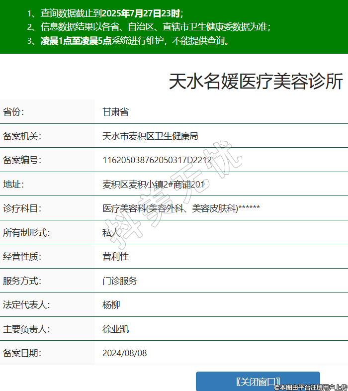 省份:甘肅省備案機(jī)關(guān):天水市麥積區(qū)衛(wèi)生健康局備案編號:116205038762050317D2212地址:麥積區(qū)麥積小鎮(zhèn)2#商鋪201診療科目:醫(yī)療美容科(美容外科、美容皮膚科)******所有制形式:私人經(jīng)營性質(zhì):營利性服務(wù)方式:門診服務(wù)法定代表人:楊柳主要負(fù)責(zé)人:徐業(yè)凱備案日期:2024/08/08 -