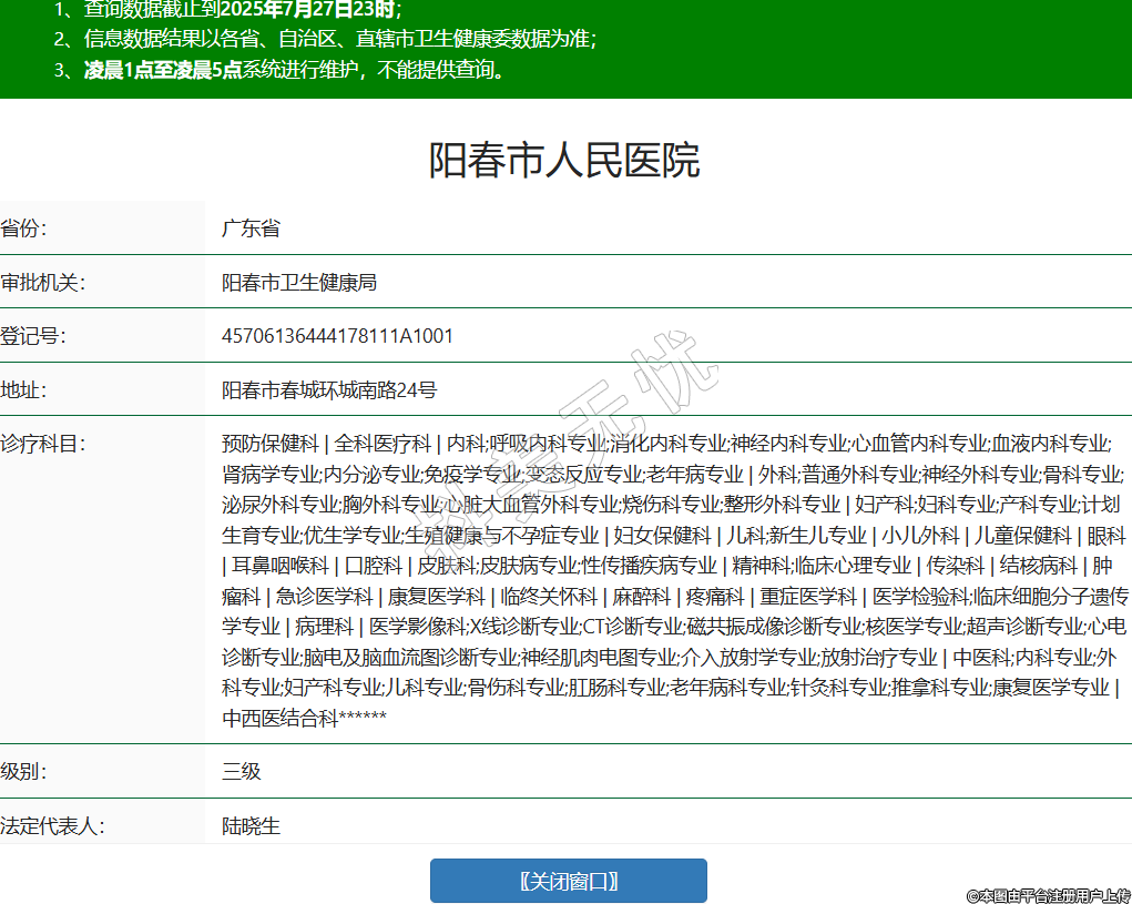 省份:廣東省審批機關(guān):陽春市衛(wèi)生健康局登記號:45706136444178111A1001地址:陽春市春城環(huán)城南路24號診療科目:預(yù)防保健科 | 全科醫(yī)療科 | 內(nèi)科;呼吸內(nèi)科專業(yè);消化內(nèi)科專業(yè);神經(jīng)內(nèi)科專業(yè);心血管內(nèi)科專業(yè);血液內(nèi)科專業(yè);腎病學(xué)專業(yè);內(nèi)分泌專業(yè);免疫學(xué)專業(yè);變態(tài)反應(yīng)專業(yè);老年病專業(yè) | 外科;普通外科專業(yè);神經(jīng)外科專業(yè);骨科專業(yè);泌尿外科專業(yè);胸外科專業(yè);心臟大血管外科專業(yè);燒傷科專業(yè);整形外科專業(yè) | 婦產(chǎn)科;婦科專業(yè);產(chǎn)科專業(yè);計劃生育專業(yè);優(yōu)生學(xué)專業(yè);生殖健康與不孕癥專業(yè) | 婦女保健科 | 兒科;新生兒專業(yè) | 小兒外科 | 兒童保健科 | 眼科 | 耳鼻咽喉科 | 口腔科 | 皮膚科;皮膚病專業(yè);性傳播疾病專業(yè) | 精神科;臨床心理專業(yè) | 傳染科 | 結(jié)核病科 | 腫瘤科 | 急診醫(yī)學(xué)科 | 康復(fù)醫(yī)學(xué)科 | 臨終關(guān)懷科 | 麻醉科 | 疼痛科 | 重癥醫(yī)學(xué)科 | 醫(yī)學(xué)檢驗科;臨床細(xì)胞分子遺傳學(xué)專業(yè) | 病理科 | 醫(yī)學(xué)影像科;X線診斷專業(yè);CT診斷專業(yè);磁共振成像診斷專業(yè);核醫(yī)學(xué)專業(yè);超聲診斷專業(yè);心電診斷專業(yè);腦電及腦血流圖診斷專業(yè);神經(jīng)肌肉電圖專業(yè);介入放射學(xué)專業(yè);放射治療專業(yè) | 中醫(yī)科;內(nèi)科專業(yè);外科專業(yè);婦產(chǎn)科專業(yè);兒科專業(yè);骨傷科專業(yè);肛腸科專業(yè);老年病科專業(yè);針灸科專業(yè);推拿科專業(yè);康復(fù)醫(yī)學(xué)專業(yè) | 中西醫(yī)結(jié)合科******級別:三級法定代表人:陸曉生主要負(fù)責(zé)人:陸曉生執(zhí)業(yè)許可證有效期:2022/12/20 -至- 2037/12/20 -