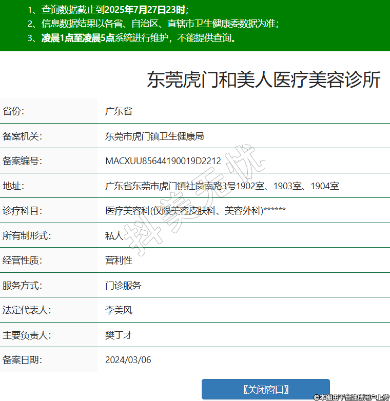 省份:廣東省備案機關(guān):東莞市虎門鎮(zhèn)衛(wèi)生健康局備案編號:MACXUU85644190019D2212地址:廣東省東莞市虎門鎮(zhèn)社崗南路3號1902室、1903室、1904室診療科目:醫(yī)療美容科(僅限美容皮膚科、美容外科)******所有制形式:私人經(jīng)營性質(zhì):營利性服務(wù)方式:門診服務(wù)法定代表人:李美風(fēng)主要負責(zé)人:樊丁才備案日期:2024/03/06 -