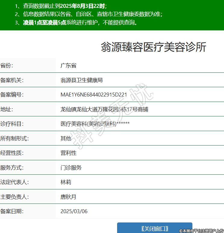 省份:廣東省備案機(jī)關(guān):翁源縣衛(wèi)生健康局備案編號(hào):MAE1Y6NE6844022915D221地址:龍仙鎮(zhèn)龍仙大道萬隆花園5棟17號(hào)商鋪診療科目:醫(yī)療美容科(美容皮膚科)******所有制形式:其他經(jīng)營性質(zhì):營利性服務(wù)方式:門診服務(wù)法定代表人:林莉主要負(fù)責(zé)人:唐秋月備案日期:2025/03/06 -
