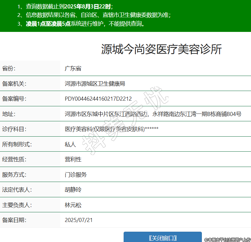 省份:廣東省備案機關(guān):河源市源城區(qū)衛(wèi)生健康局備案編號:PDY00446244160217D2212地址:河源市區(qū)東城中片區(qū)東江西路西邊,永祥路南邊東江灣一期B棟商鋪B04號診療科目:醫(yī)療美容科(僅限醫(yī)療美容皮膚科)******所有制形式:私人經(jīng)營性質(zhì):營利性服務(wù)方式:門診服務(wù)法定代表人:胡靜玲主要負(fù)責(zé)人:林元松備案日期:2025/07/21 -